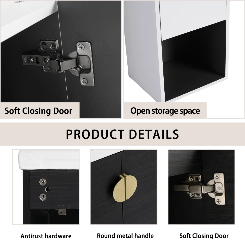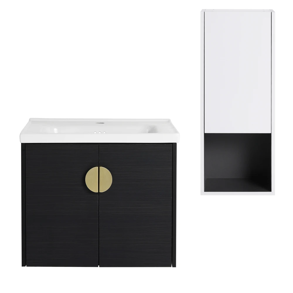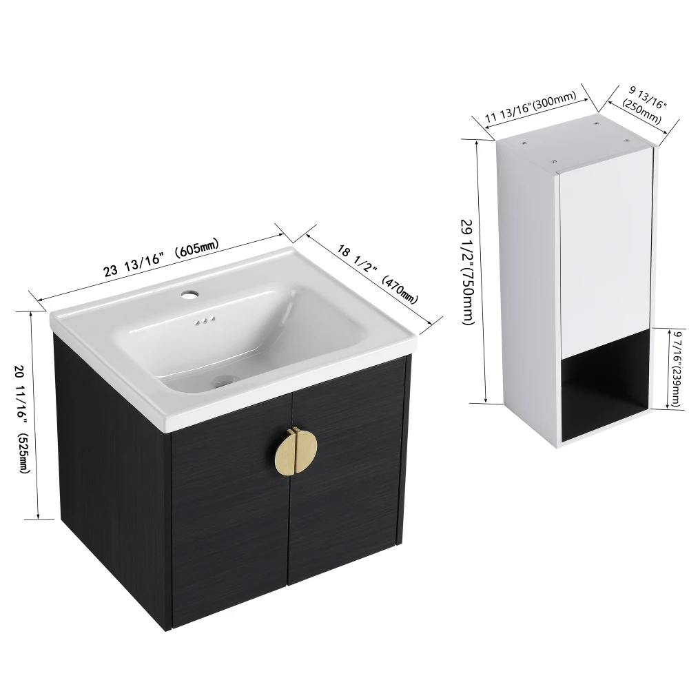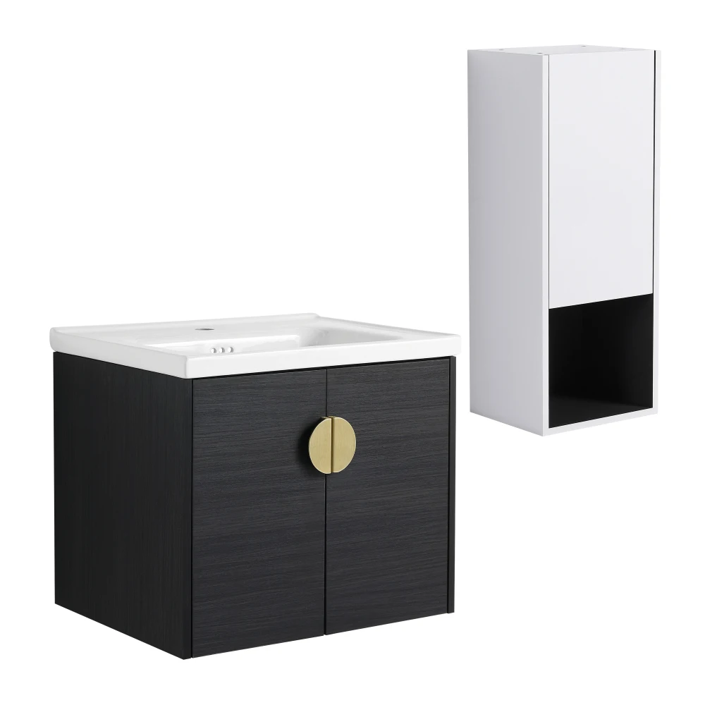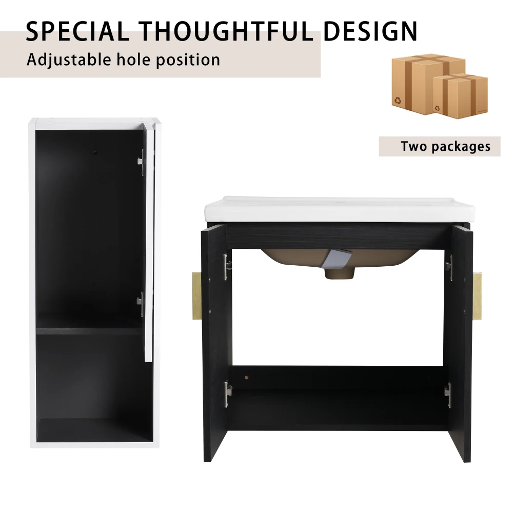 24" стенен шкаф за баня с керамична мивка и страничен шкаф, врати с плавно затваряне, комбиниран шкаф (KD-опаковка)