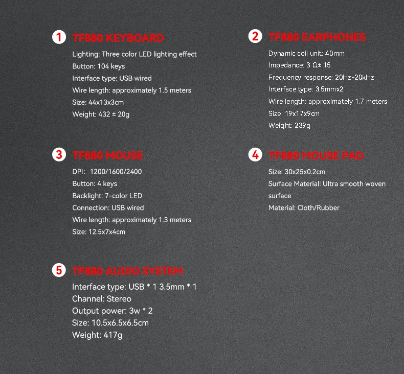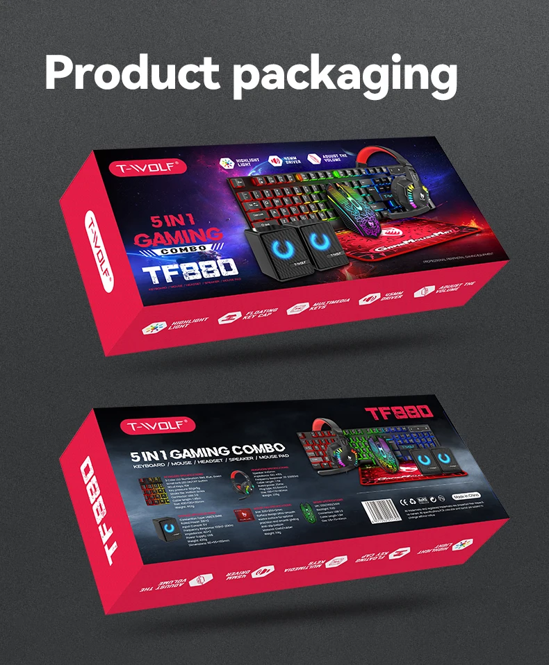 Петчастова геймърска комбинация от 104 клавиша, 4-цветна дишаща светлинна мишка, 3,5 мм геймърски слушалки, високоговорител, противоплъзгаща подложка за мишка