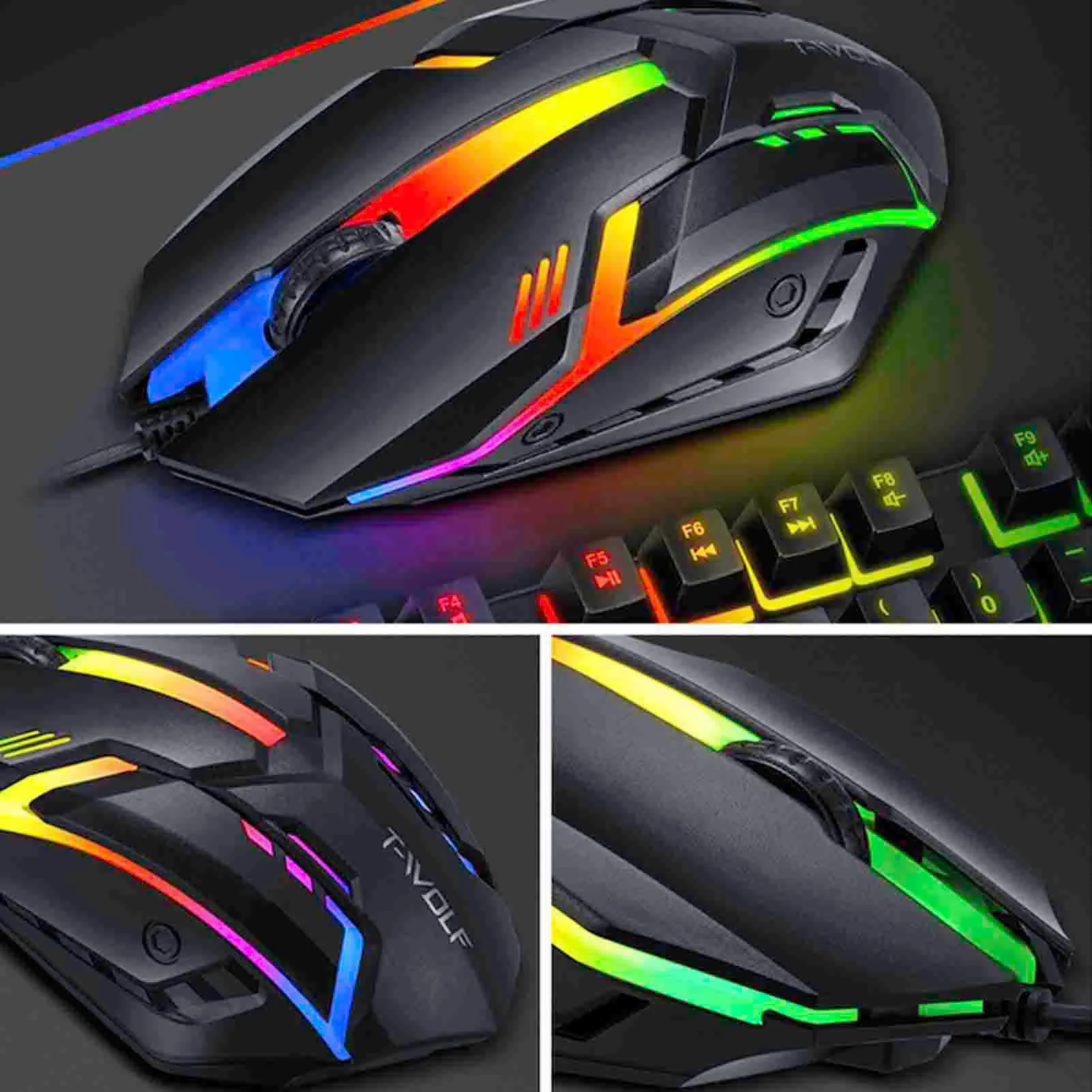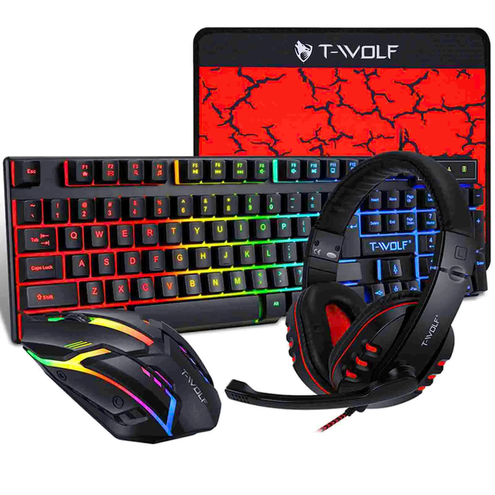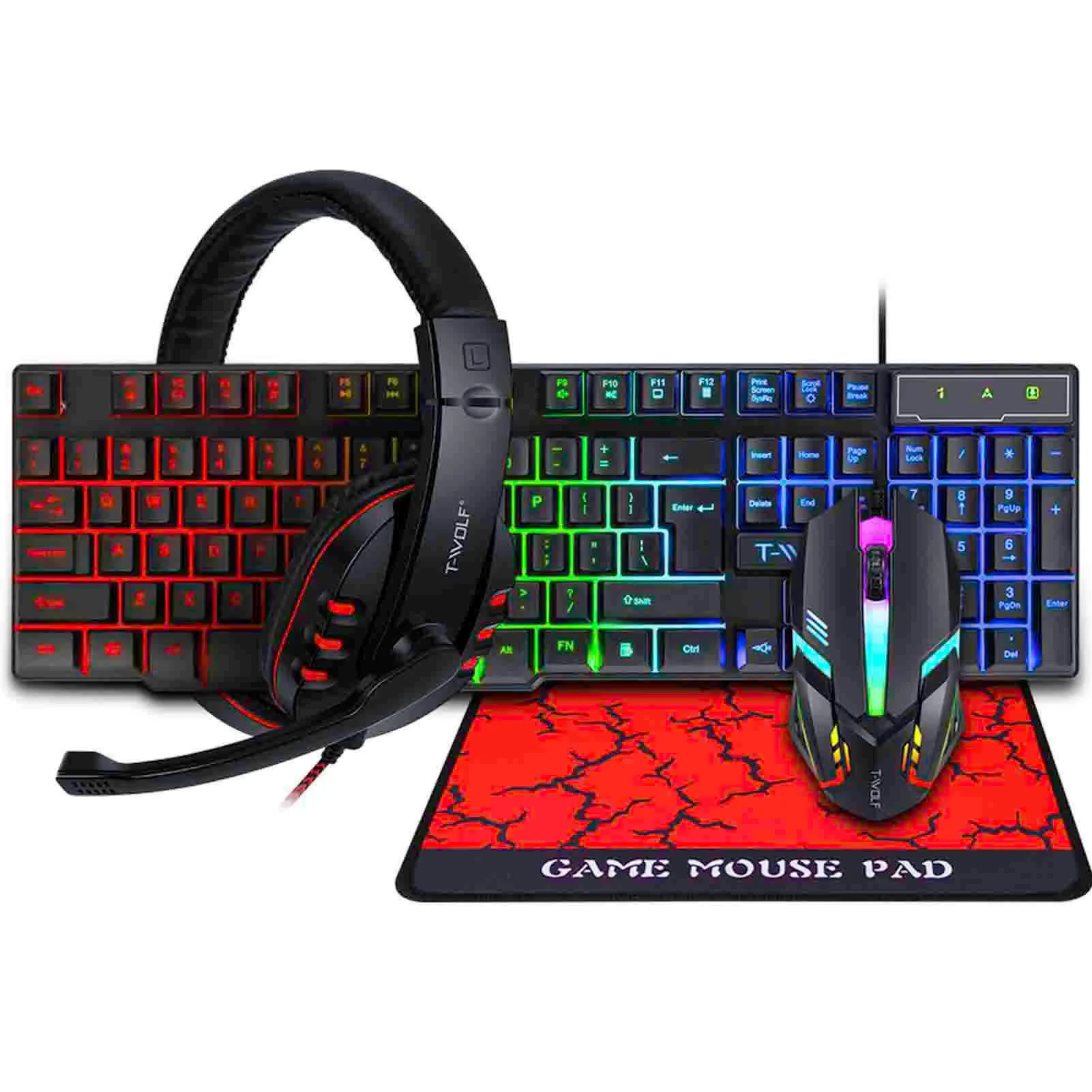 T-WOLF TF800 Геймърска комбинация от четири части, 104 клавиша, 4-цветна дишаща светлинна мишка, 3.5 мм геймърски слушалки, противоплъзгаща подложка за мишка.