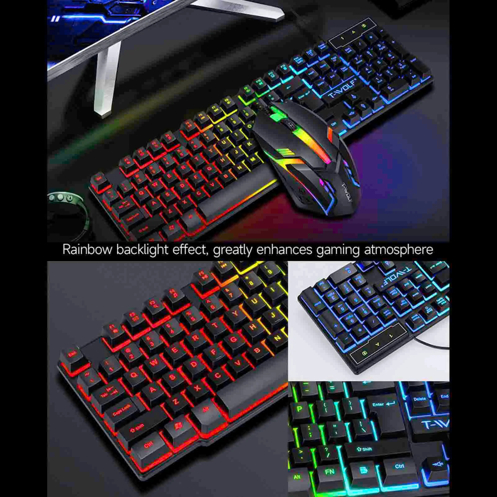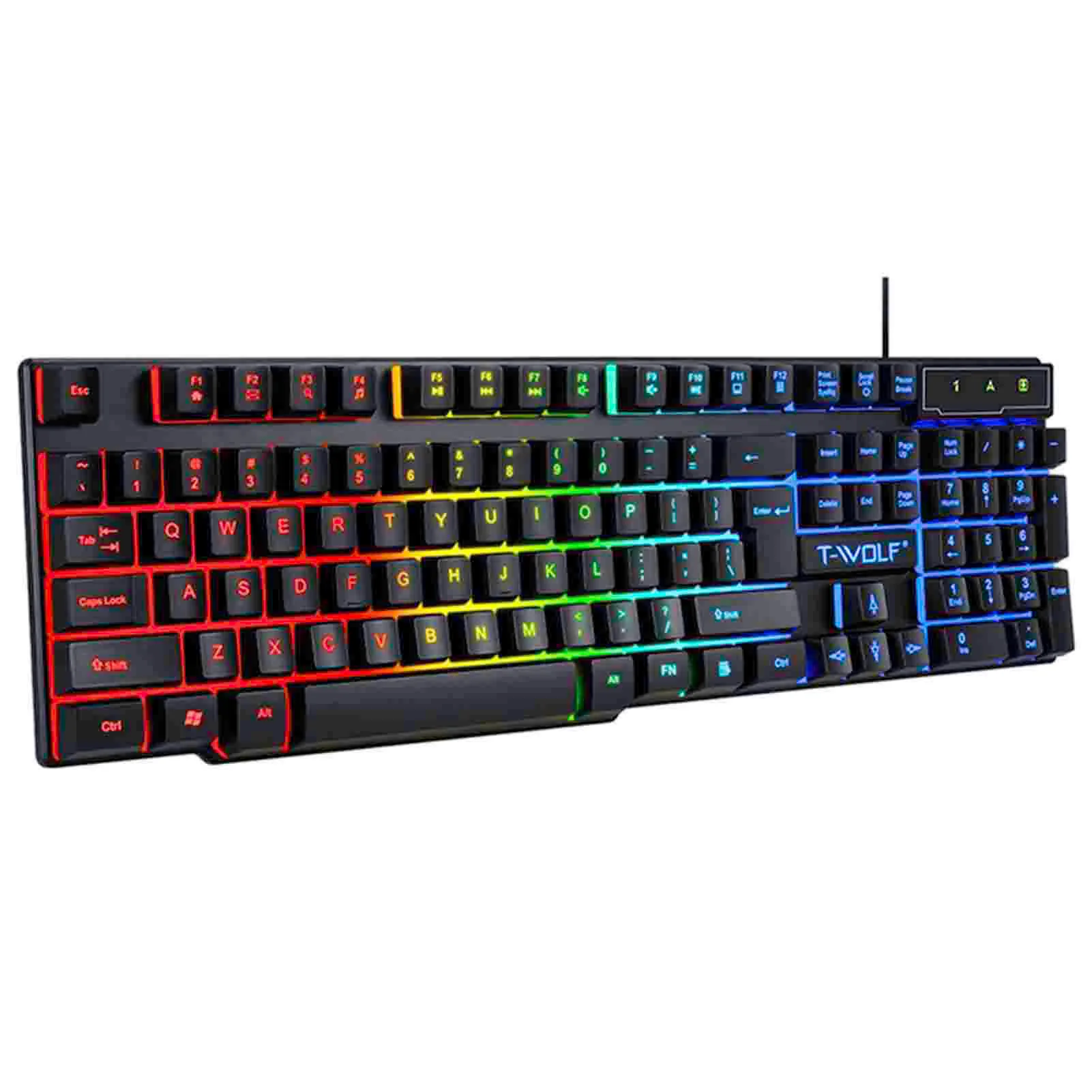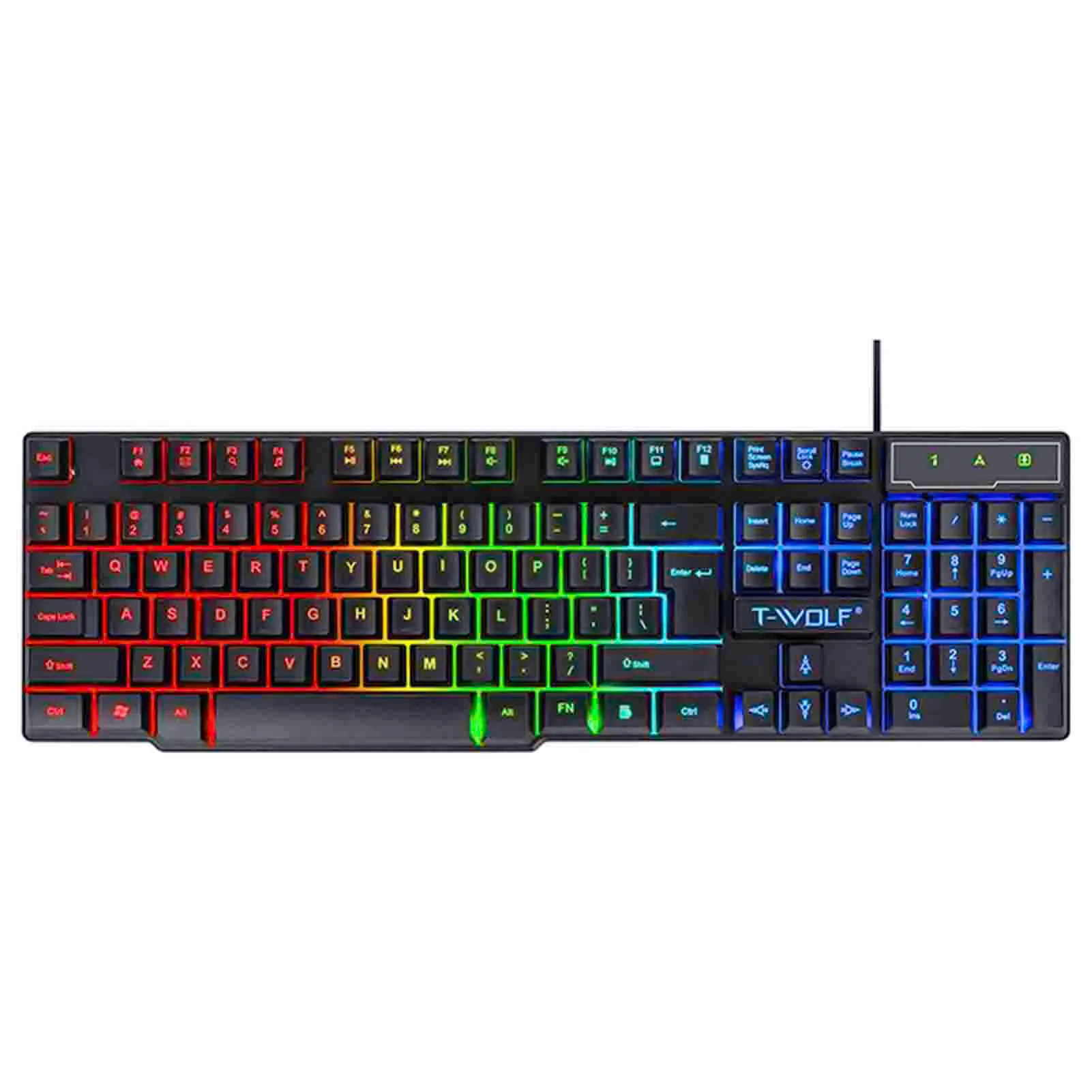 T-WOLF TF800 Геймърска комбинация от четири части, 104 клавиша, 4-цветна дишаща светлинна мишка, 3.5 мм геймърски слушалки, противоплъзгаща подложка за мишка.