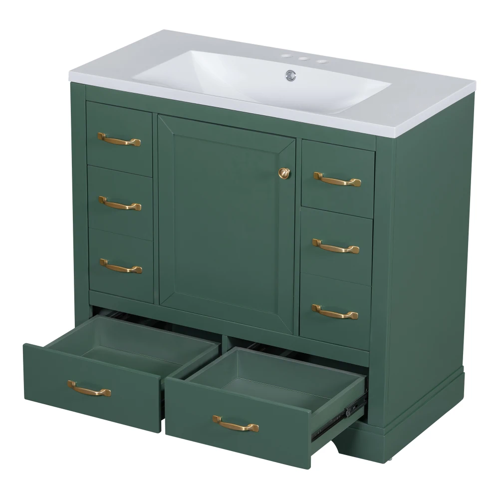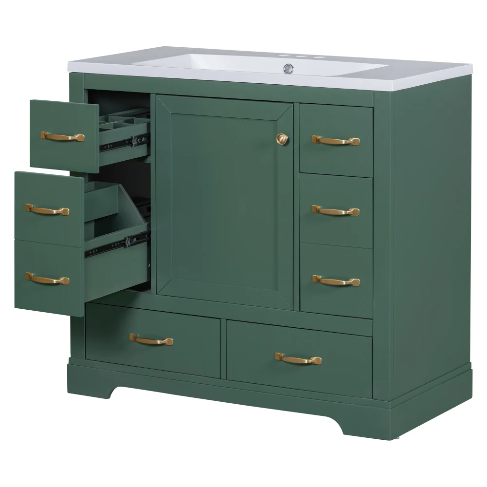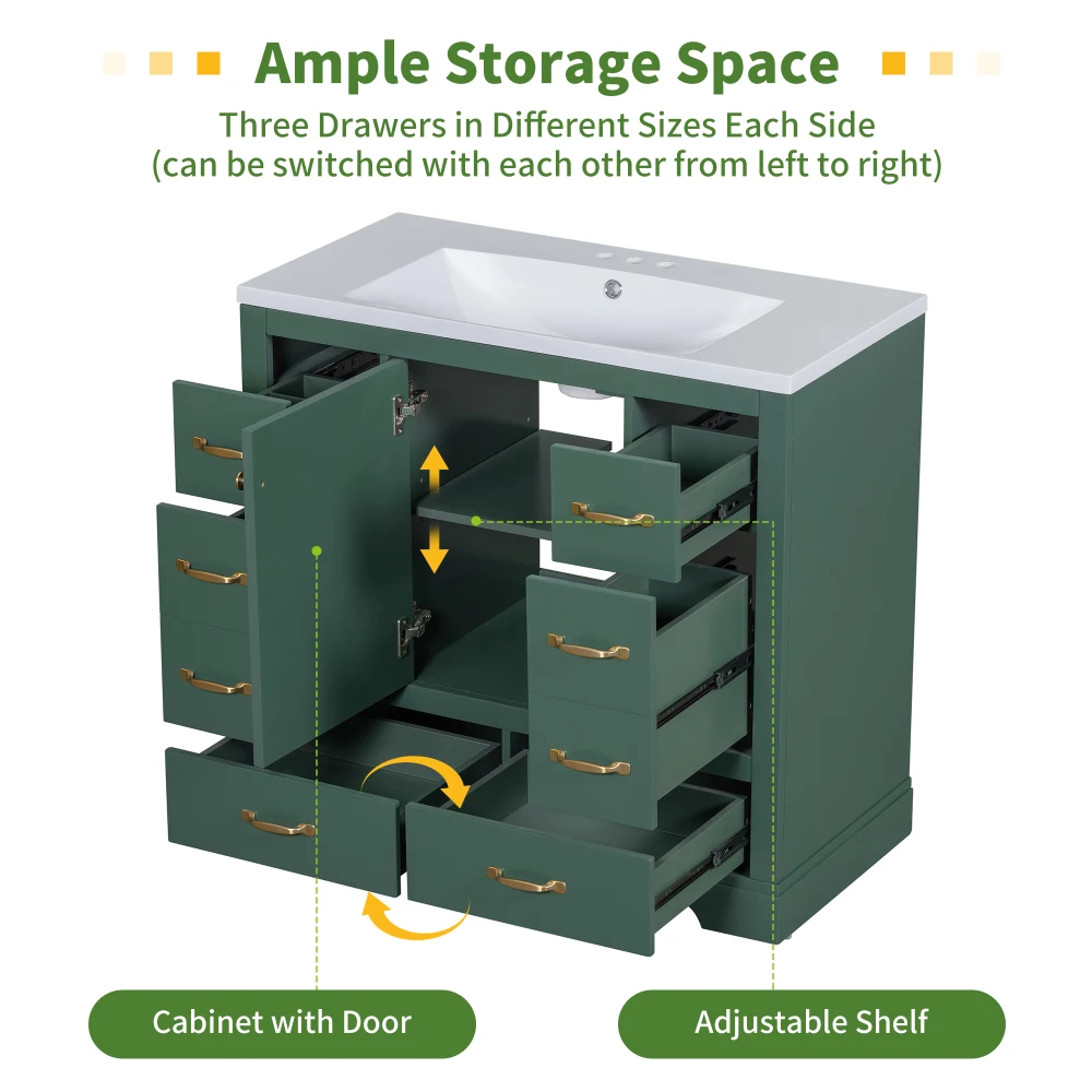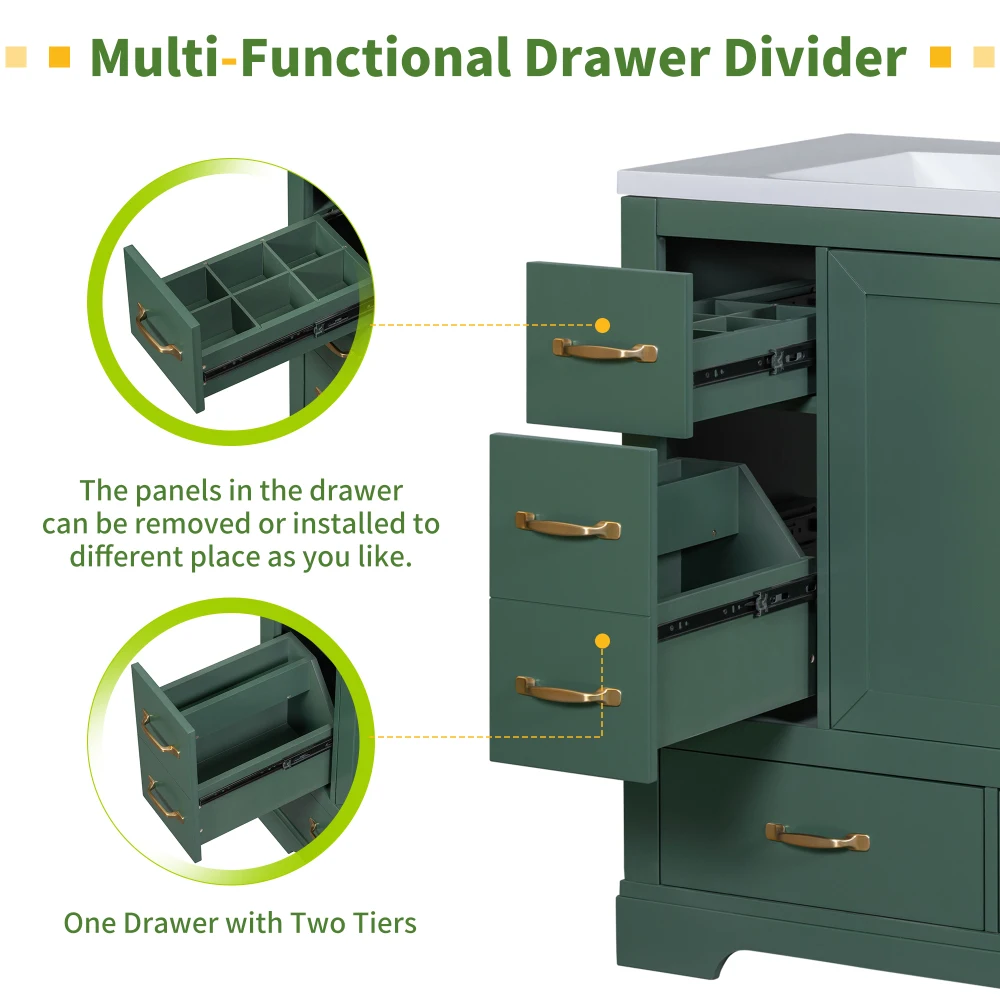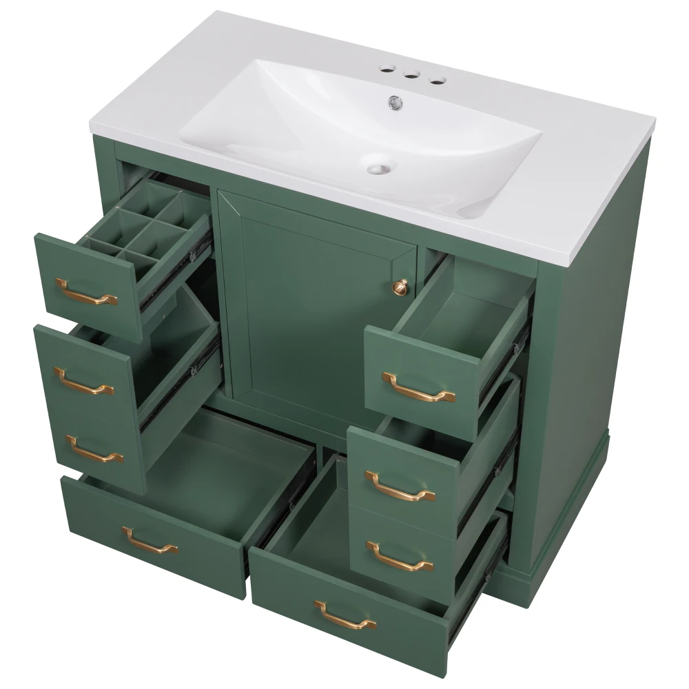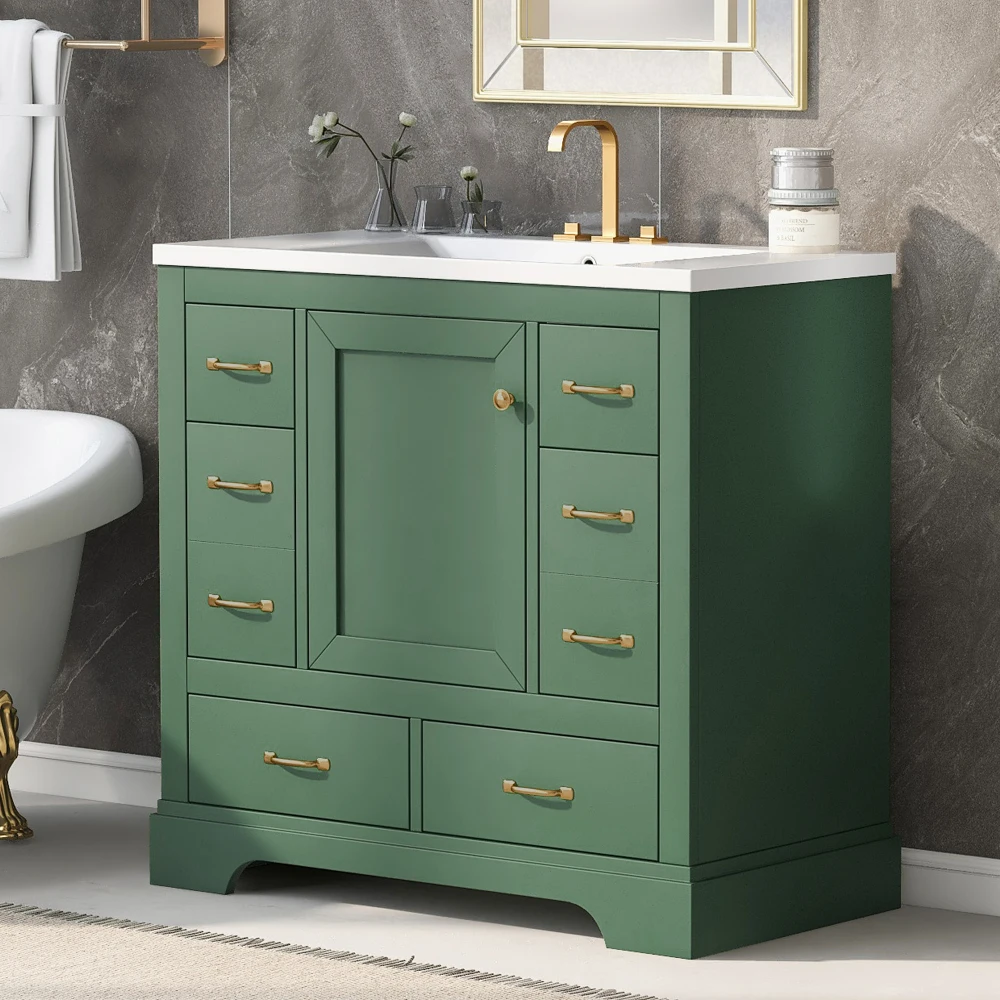 91,4 cm Badezimmer-Waschtisch mit Waschbecken-Kombination, sechs Schubladen, multifunktionaler Schubladenteiler, verstellbares Regal, grün