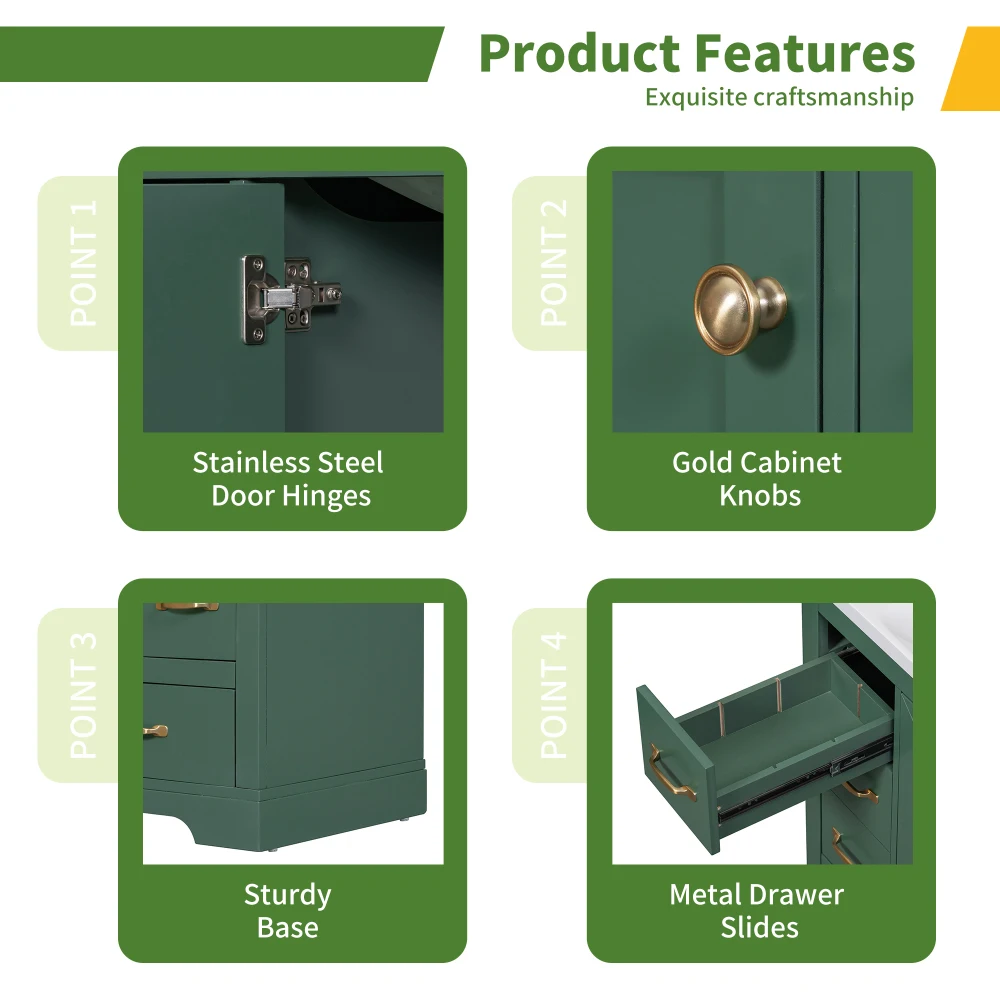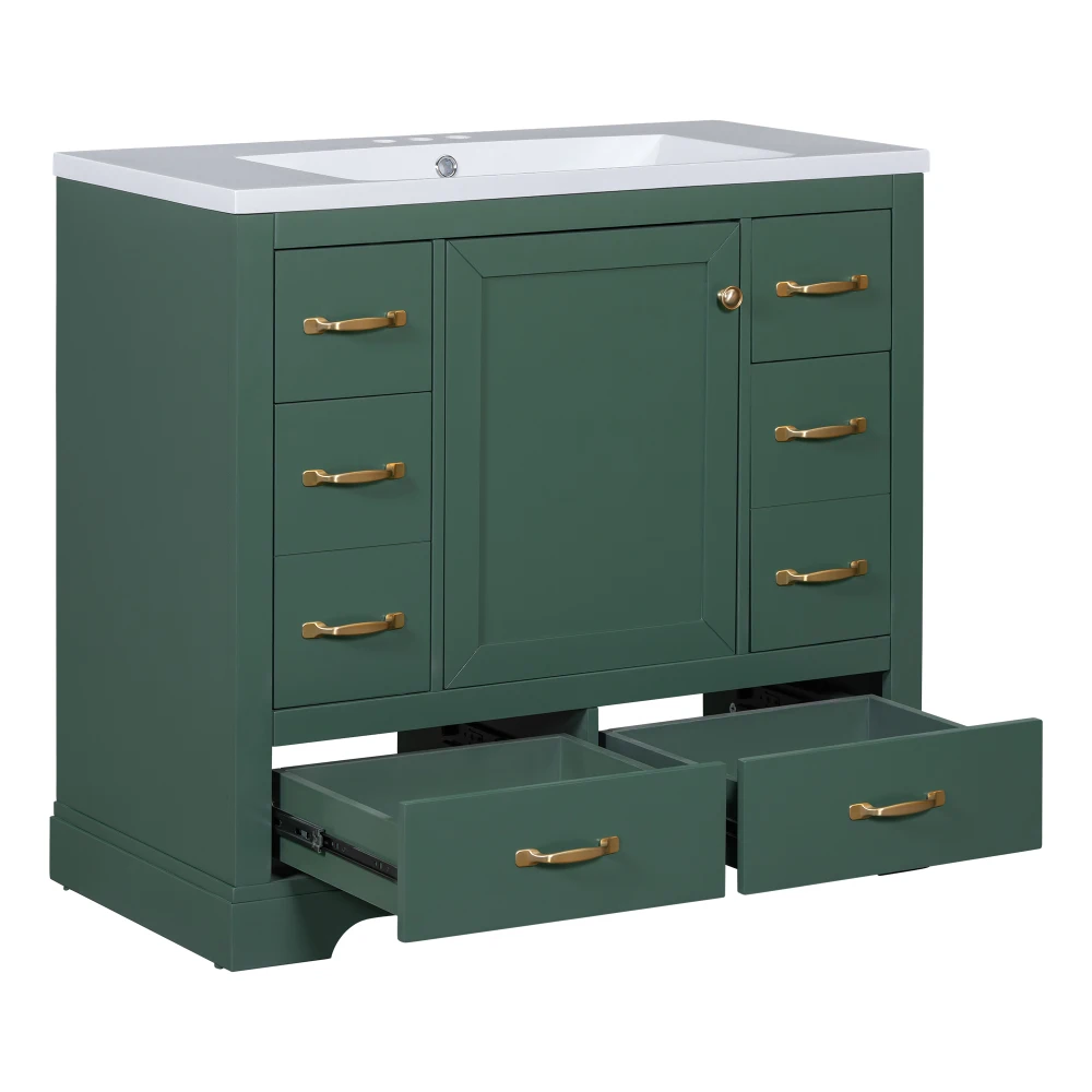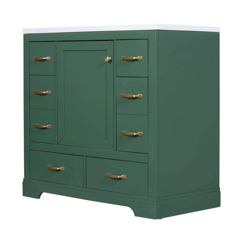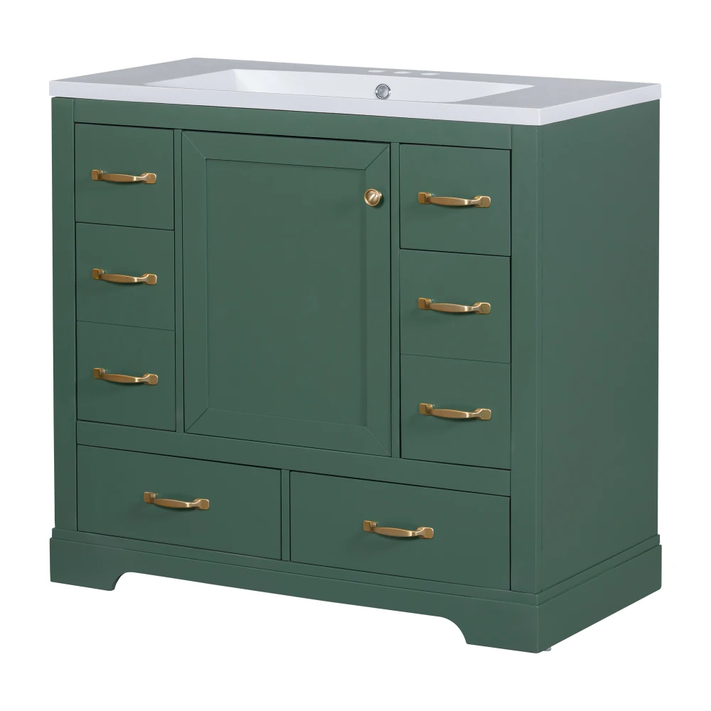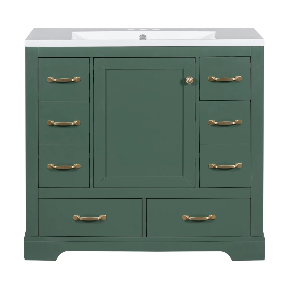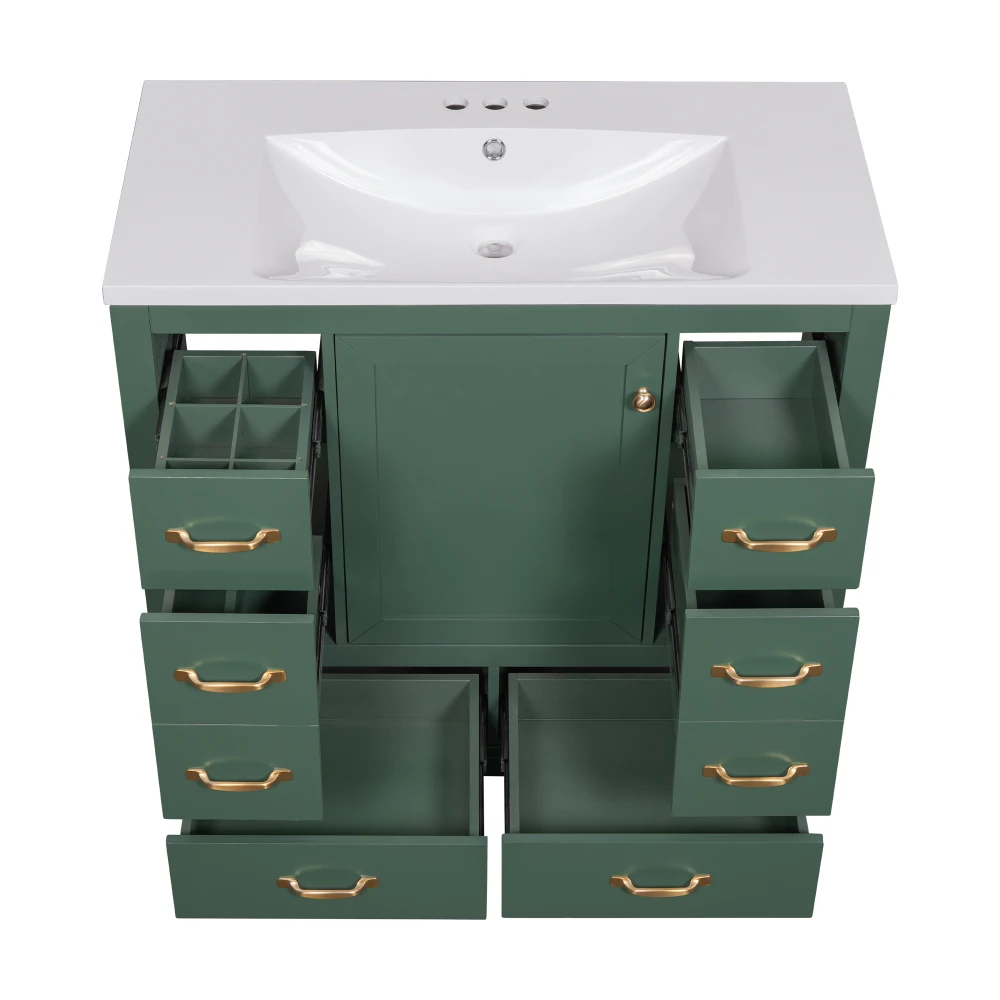 91,4 cm Badezimmer-Waschtisch mit Waschbecken-Kombination, sechs Schubladen, multifunktionaler Schubladenteiler, verstellbares Regal, grün