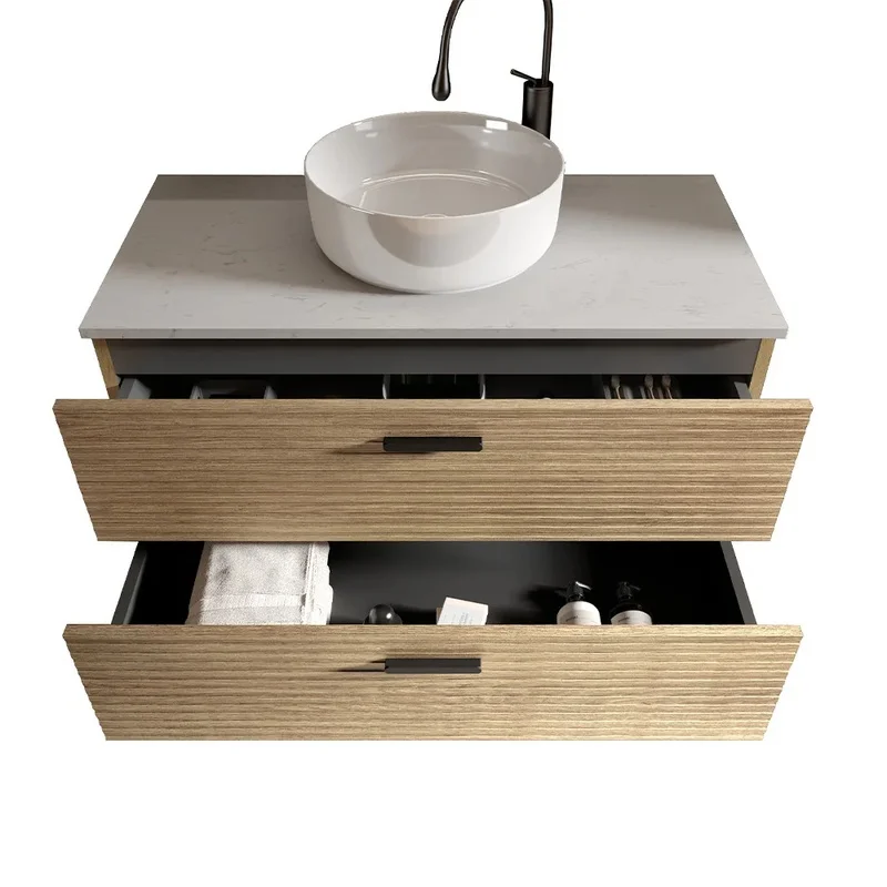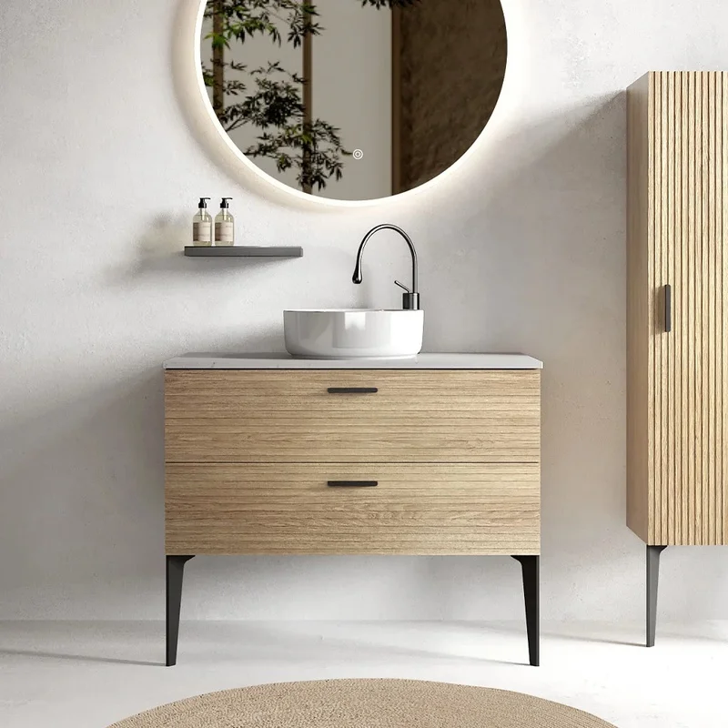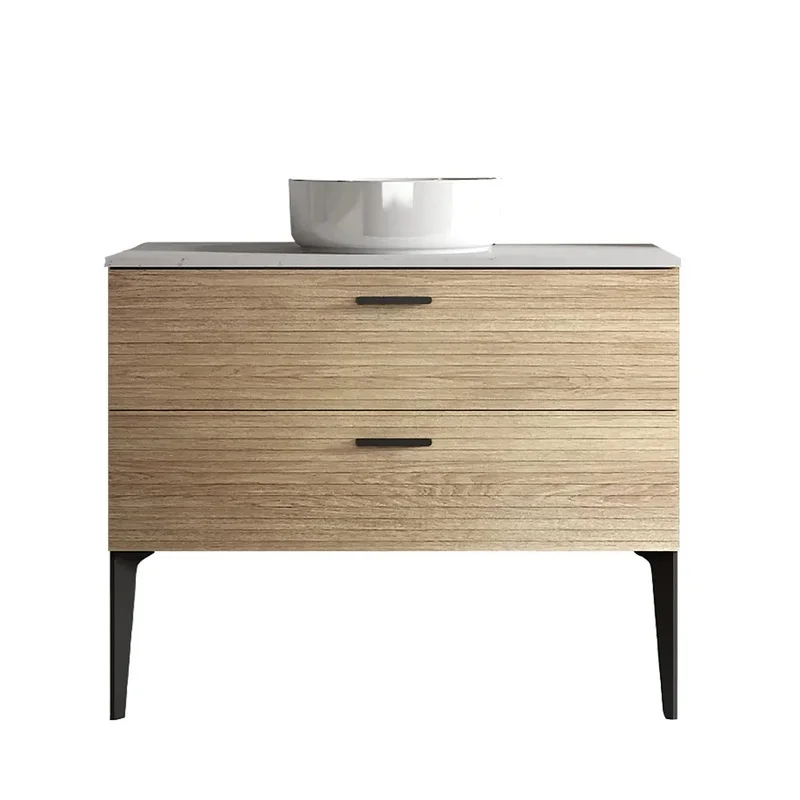 36" gestreifter freistehender Badezimmerwaschtisch aus natürlicher Eiche mit Keramikwaschbecken für moderne Räume