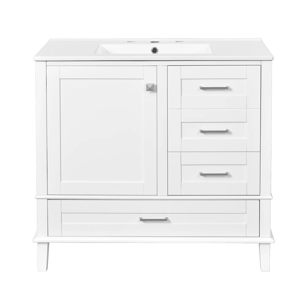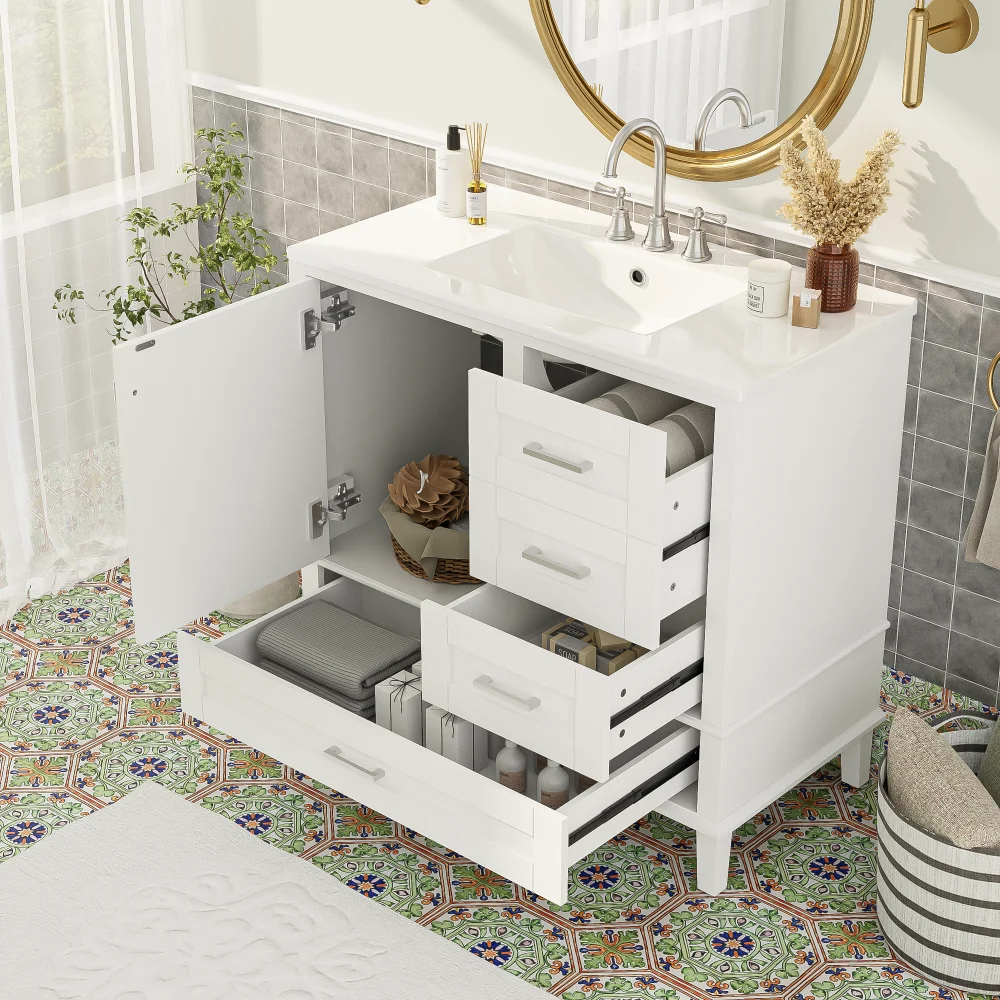 91,4 cm weißer Badezimmerwaschtisch mit Rahmen aus massivem Kiefernholz, 1 Tür mit Soft-Close-Funktion und 3 Schubladen, moderner Aufbewahrungsschrank