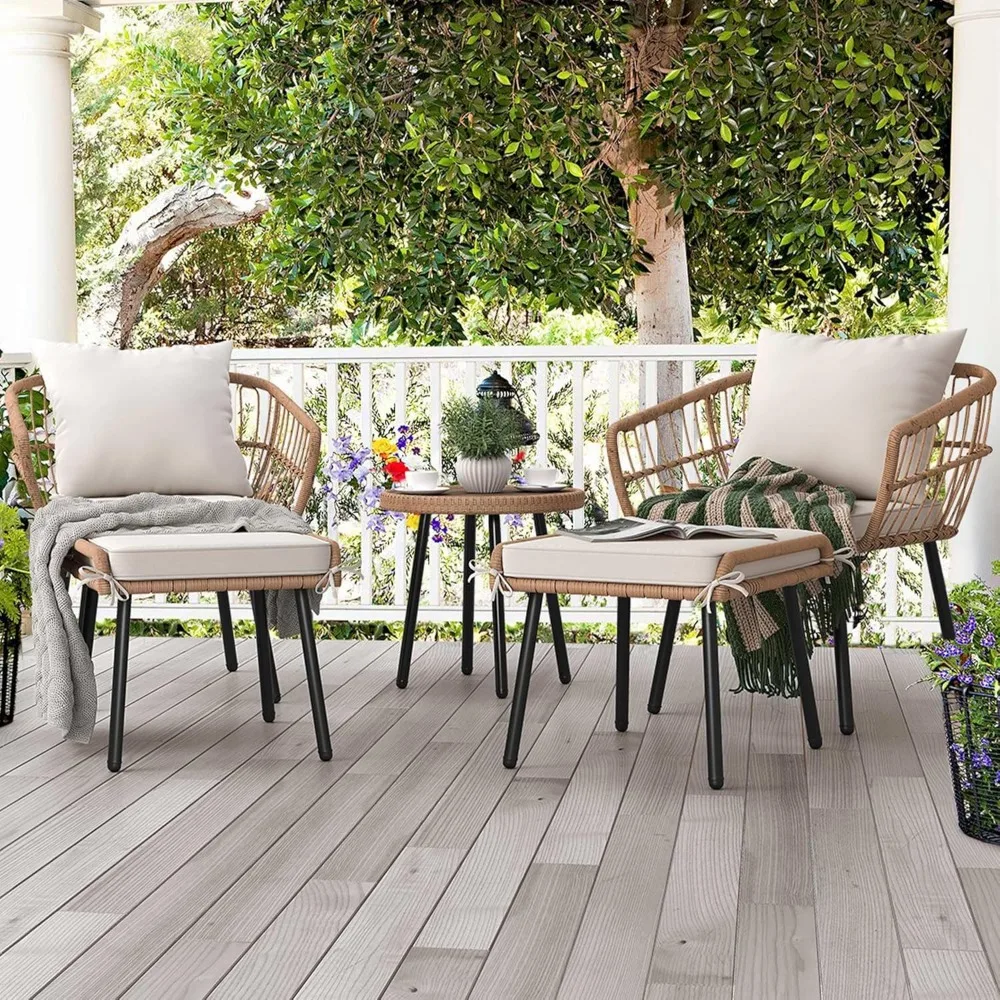 - Cleveres Design: Dieses 5-teilige Bistro-Set verfügt über zwei Fußstützen, die es Ihnen erleichtern, sich zu entspannen und die Füße hochzulegen. Jeder Ottoman kann auch als Hocker verwendet werden und trägt bis zu 113 kg, was dieses Terrassenmöbel-Set vielseitig einsetzbar macht. Geeignet für verschiedene Outdoor-Szenen – Hinterhof, Terrasse, Balkon, Garten