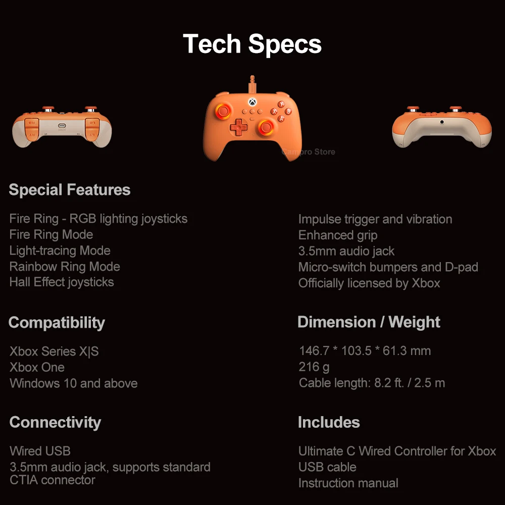 Special Features: Fire Ring - RGB lighting joysticks:Fire Ring Mode,Light-tracing Mode,Rainbow Ring Mode;Hall Effect triggers and joysticks;Impulse trigger and vibration;Enhanced grip;3.5mm audio jack;Upgraded bumpers and D-pad;Officially licensed by Xbox