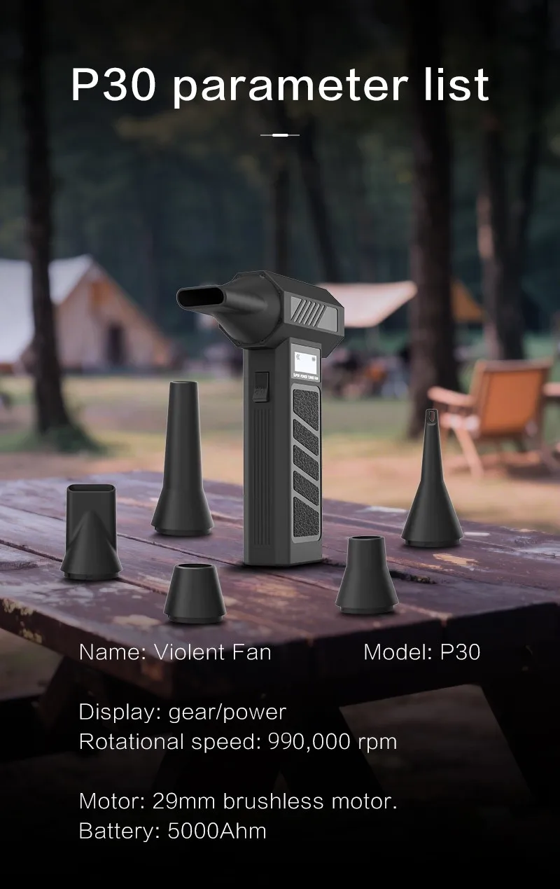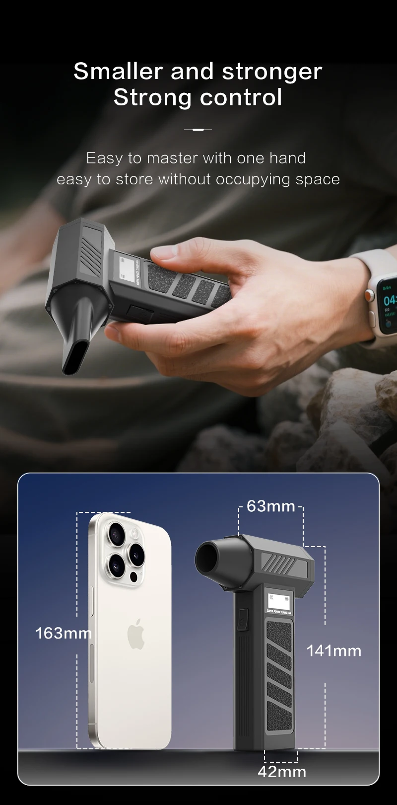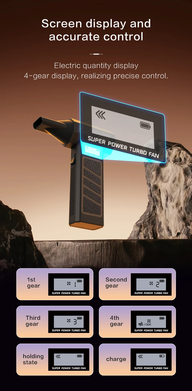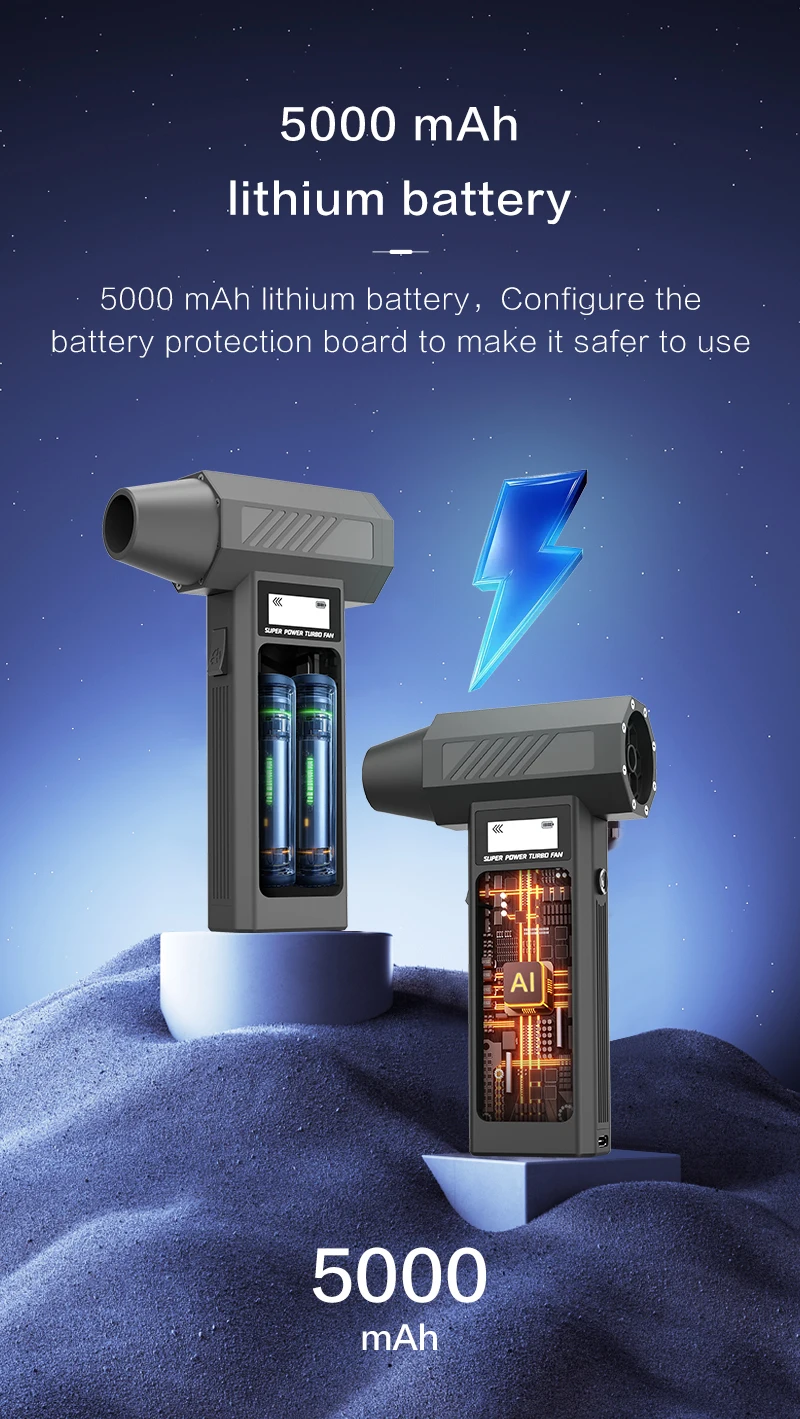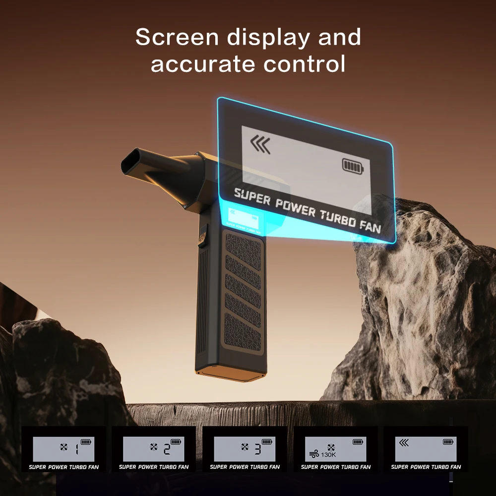 Einfache Bedienung: Stufenlose Drehzahlregelung per Knopfdruck. Das benutzerfreundliche Design der tragbaren Turbolüfter gewährleistet eine einfache Funktionalität. Darüber hinaus verfügt die Ladeplatine über sichere und zuverlässige Ladeschutz- und Überhitzungsschutzfunktionen. Der interne bürstenlose Motor erreicht hohe Drehzahlen von bis zu 990.000 U/min (Umdrehungen pro Minute).