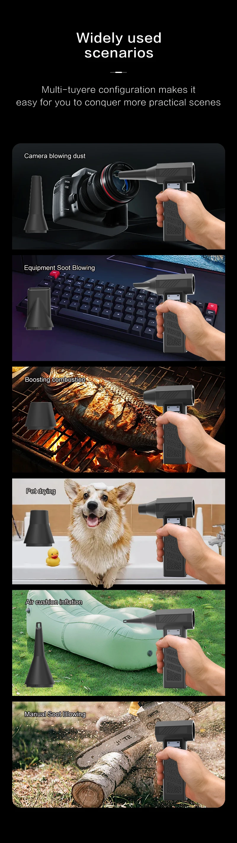 Vielfältige Verwendungsmöglichkeiten: Blasen und Absaugen von Luftkissen, Reinigen von Computergeräten, Ausblasen von Industriestaub, Holzkohleverbrennung zur Unterstützung der Verbrennung, Ausblasen von Autos und Schnee, Filmaufnahmen und Winderzeugung in Filmstudios, Trocknen von Haustieren und viele andere Verwendungszwecke.