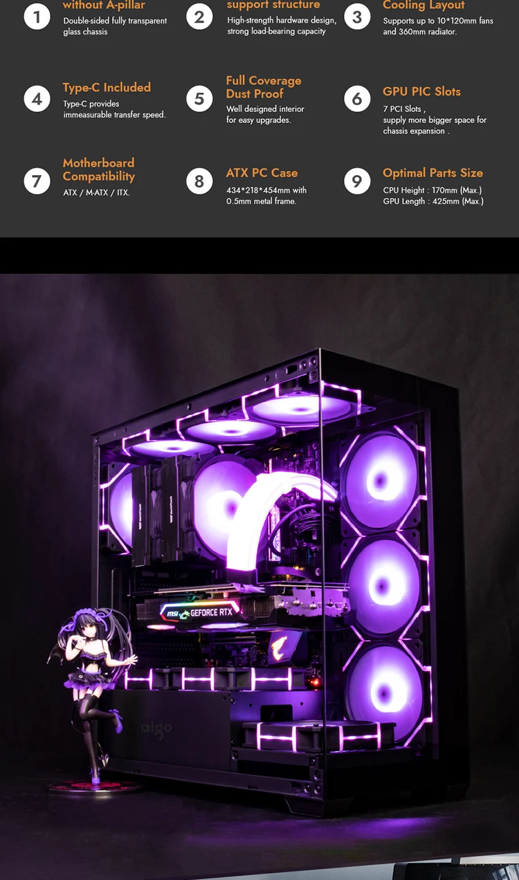 Aigo AS900 PC Case 270° Panoramic Design ATX M-ATX ITX Sea View Room Side Transparent Desktop Chassis Diy Gaming Computer Case