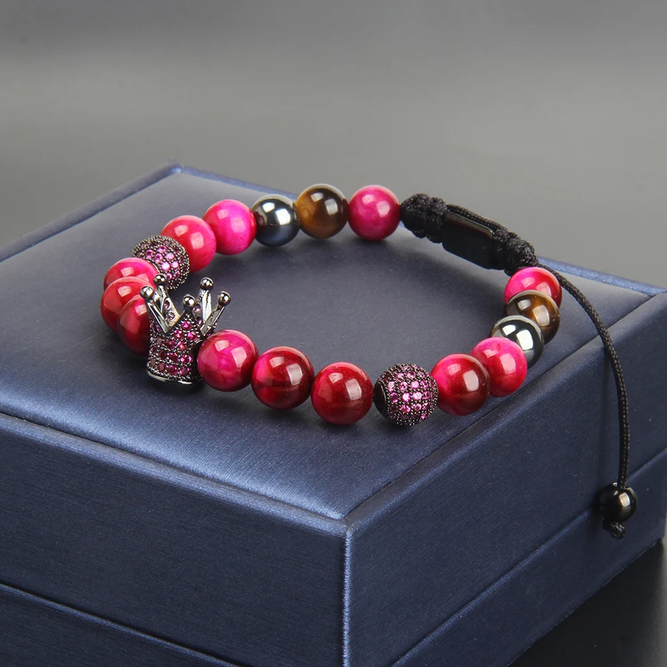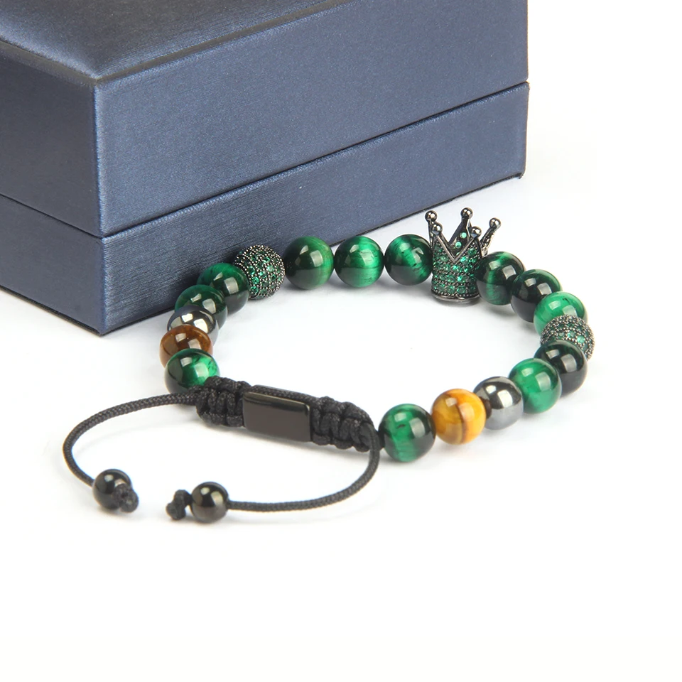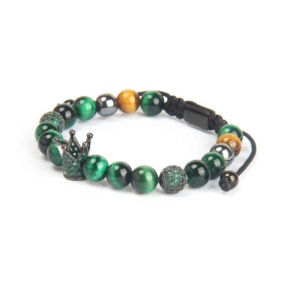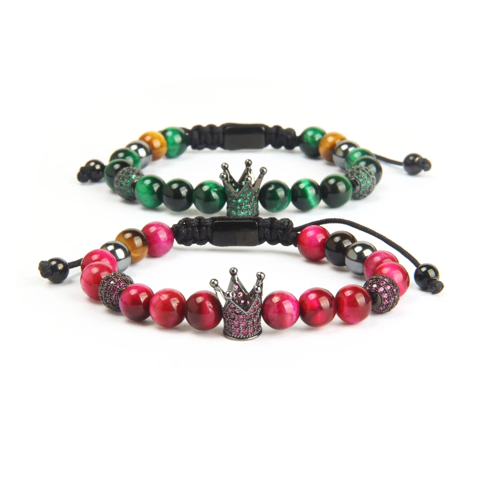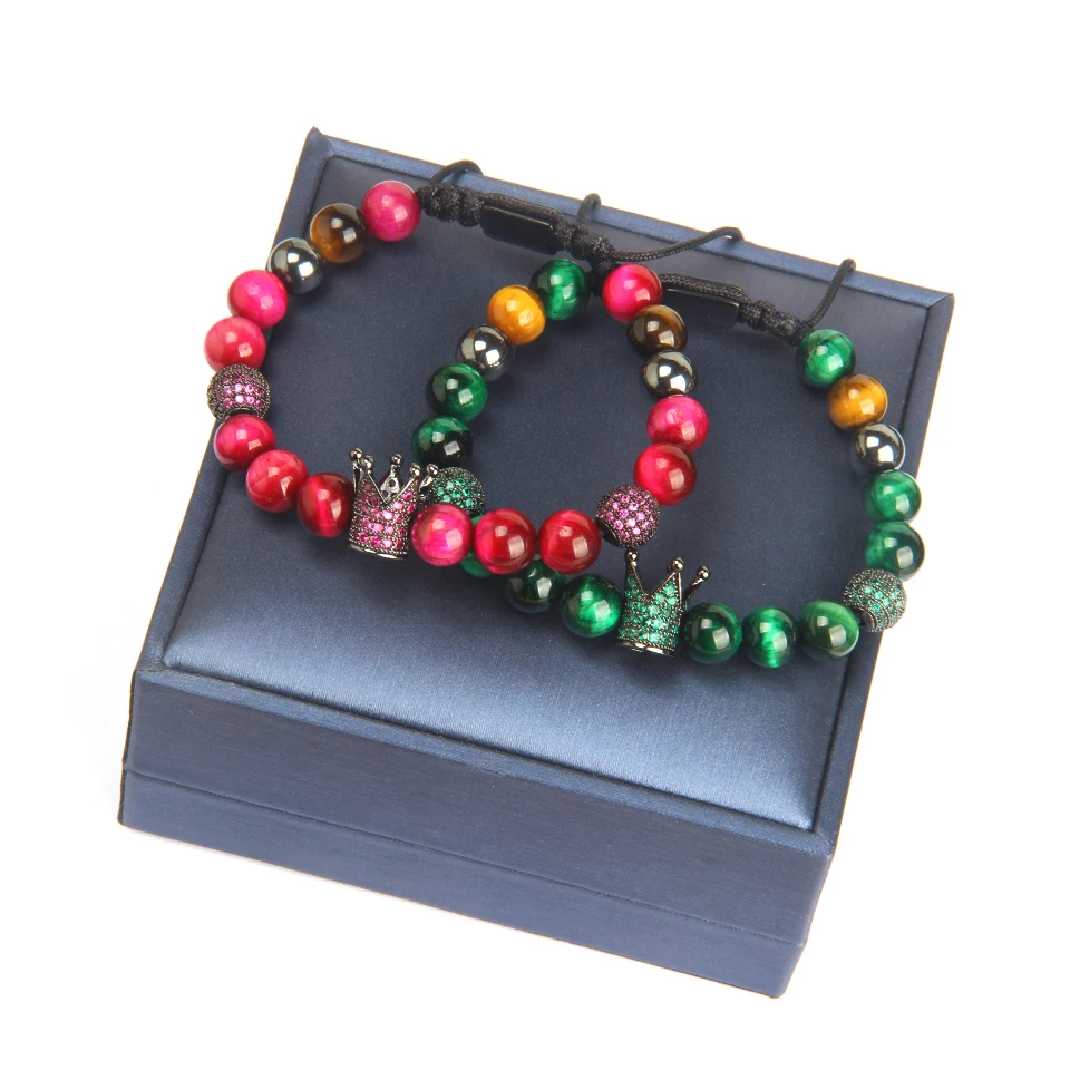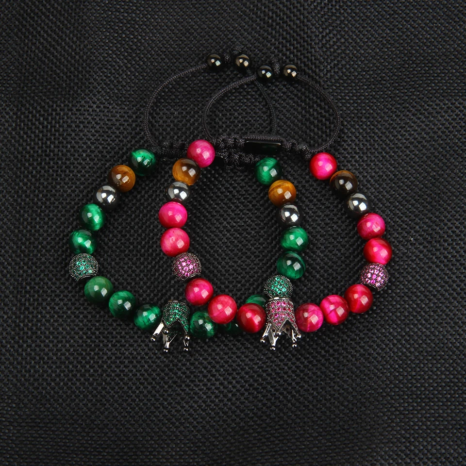 Ailatu 10 teile/los Neue Paare Crown Sets Armband Grün & Rose Natürliche Tigerauge Stein Perlen Gewinde Welle Macrame Schmuck