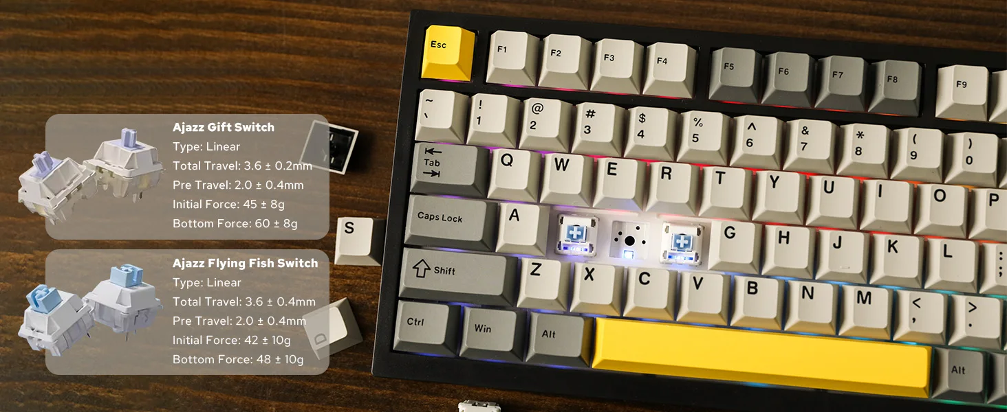 Die Ajazz AK820 Pro wurde sowohl für Enthusiasten als auch für Profis entwickelt und bietet eine unschlagbare Kombination aus Innovation und Handwerkskunst. Diese 75 % kompakte mechanische Tastatur maximiert Ihren Platz auf dem Schreibtisch und besticht durch ihr elegantes Design mit 75 % Layout. Sie ist zudem perfekt tragbar und ermöglicht nahtloses Tippen – für ein überlegenes Tipperlebnis ohne Kompromisse bei Funktionen und Funktionalität, egal wo Sie sind.