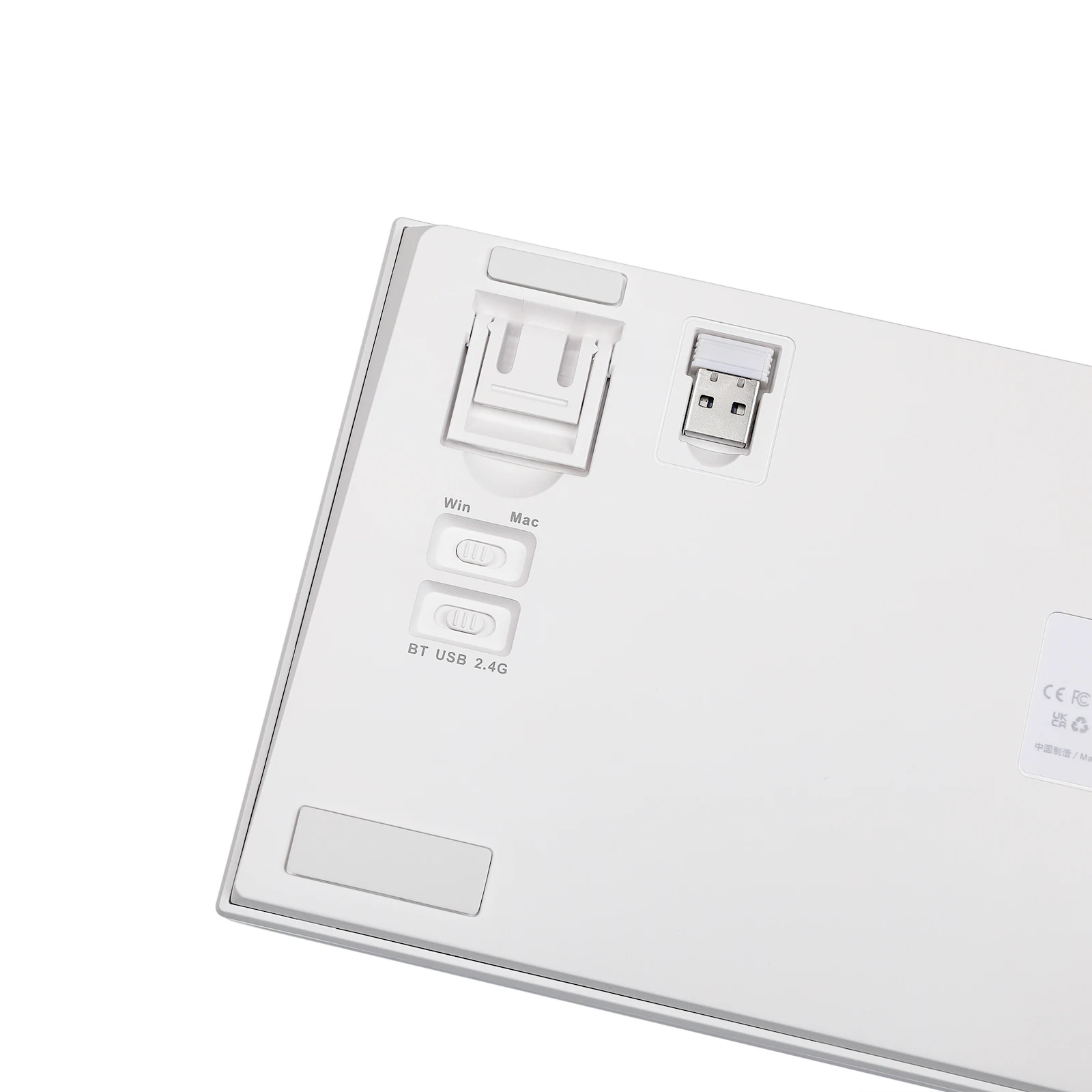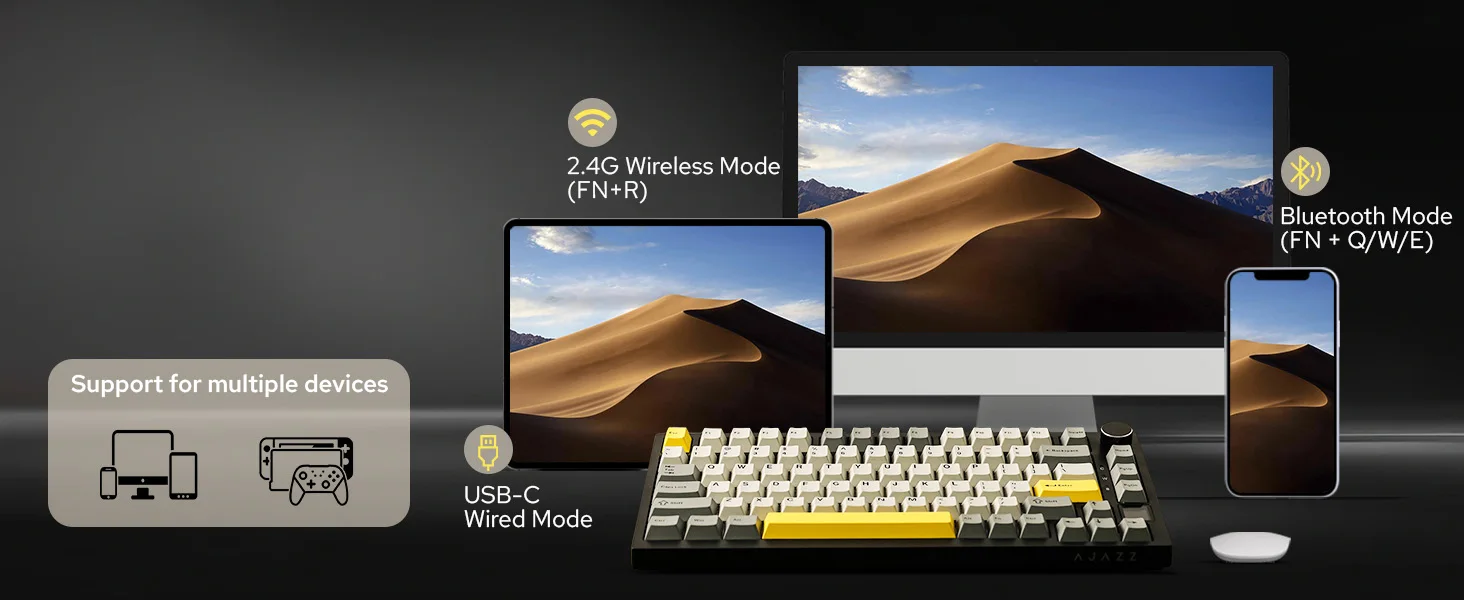 Die Ajazz AK820 Pro unterstützt die drahtlose Verbindung über Bluetooth oder 2,4 GHz oder über das mitgelieferte USB-Typ-C-Kabel. Dank Bluetooth 5.1 reagiert die Tastatur schneller und spart Strom als die Vorgängerversionen. Für effizientes Multitasking und schnelle Leistung lässt sich die Tastatur einfach zwischen drei Modi umschalten. Der mitgelieferte 4000-mAh-Akku sorgt für eine lange und zuverlässige Nutzung ohne Kurzschlussgefahr.