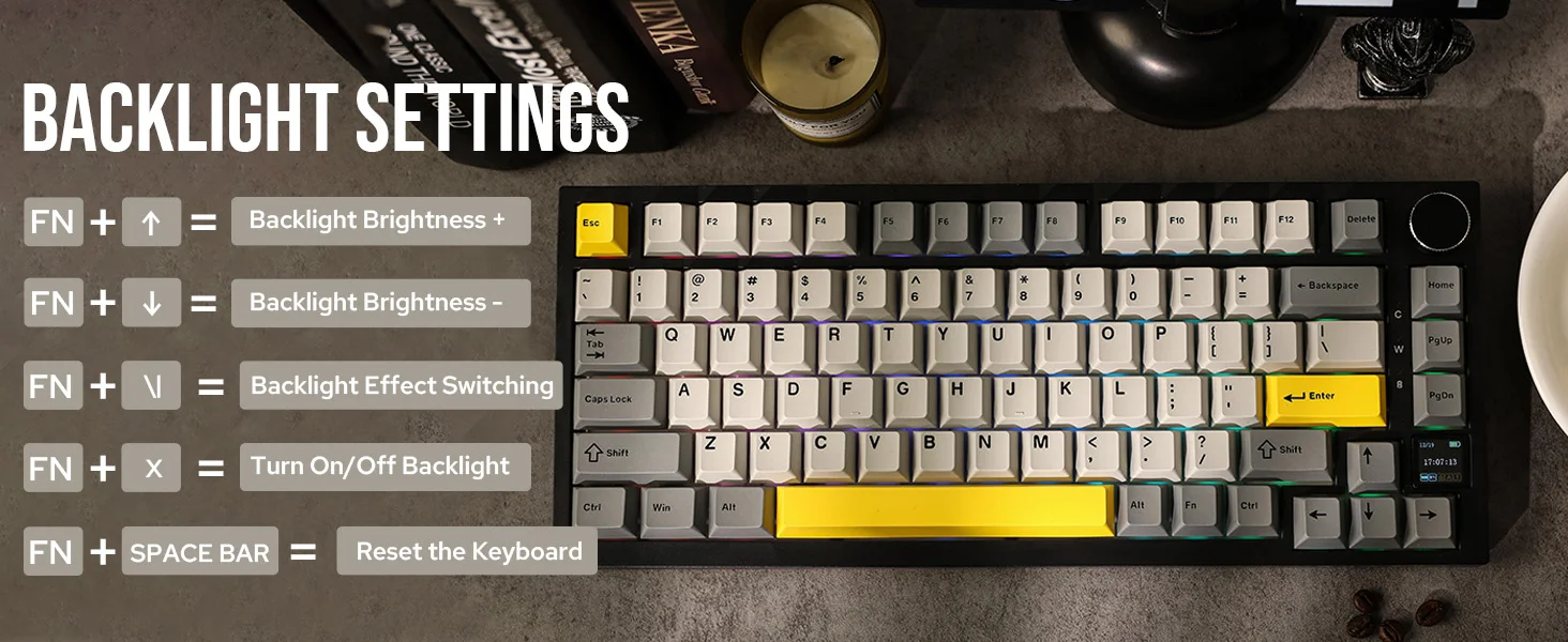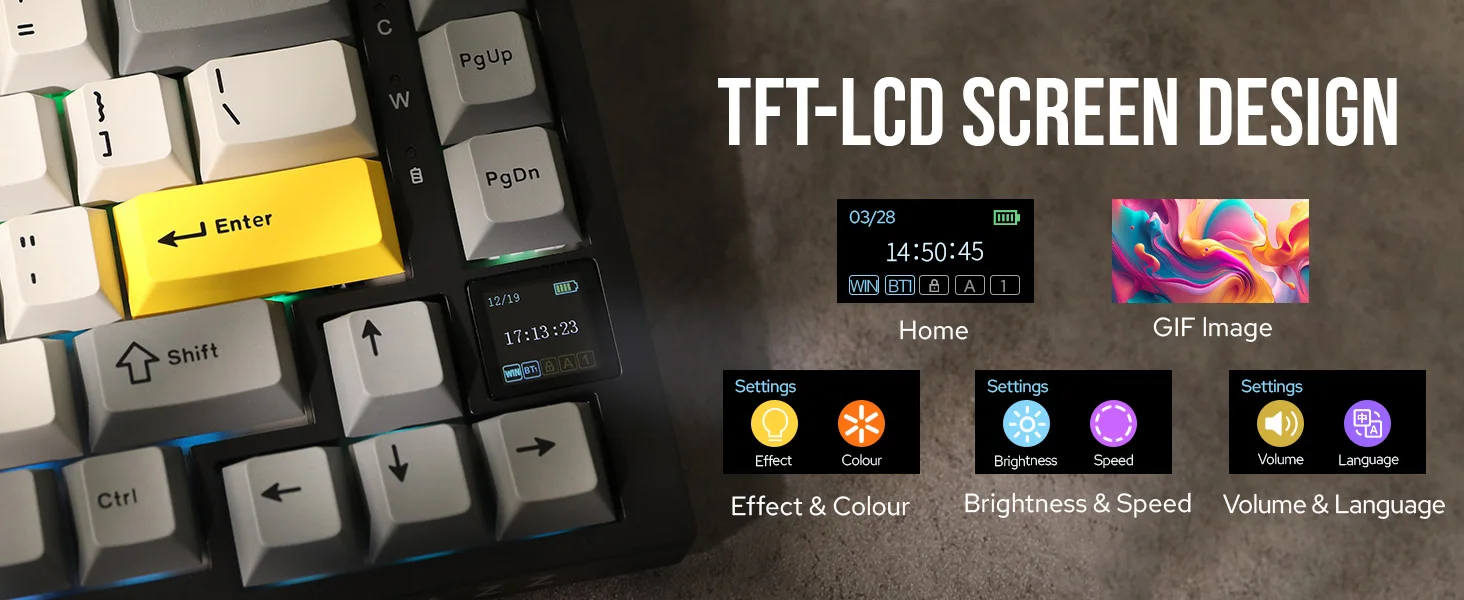 Diese 75 % mechanische Tastatur ist mit einem TFT-Bildschirm ausgestattet, der als interaktive Schnittstelle für Echtzeit-Updates und Anpassungen dient. Das hochauflösende Display ermöglicht individuelle Anpassungen der Grafik, des Batteriestatus, der Datums- und Uhrzeitanzeige, der Konnektivitäts- und Betriebssystemanzeige sowie der Hintergrundbeleuchtung. Diese Übersicht über die TFT-Bildschirmfunktionen verdeutlicht die volle Bandbreite seiner Möglichkeiten und erklärt, warum sich die Ajazz AK820 Pro von anderen Tastaturen auf dem Markt abhebt.