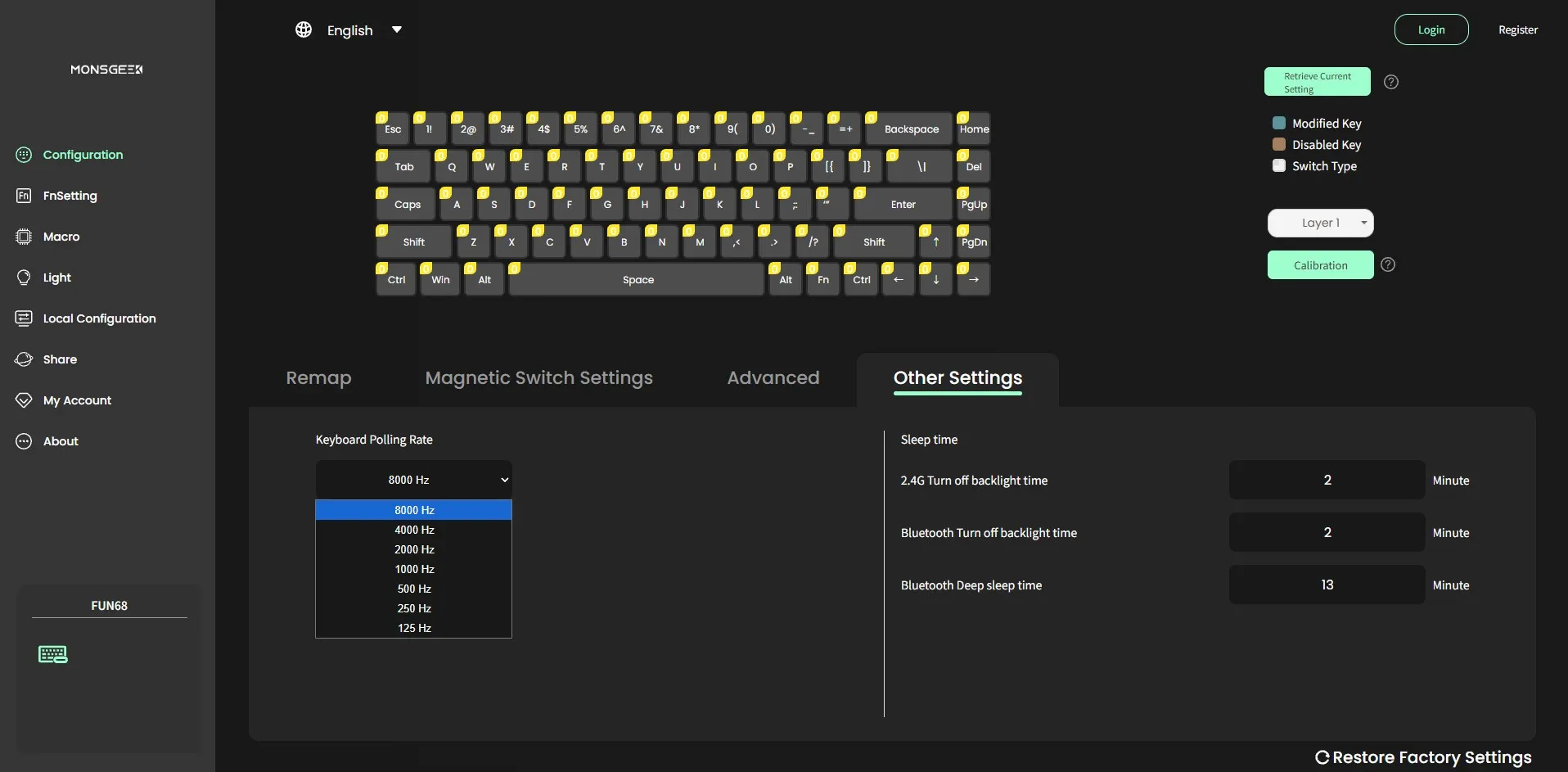 Die FUN68-Serie ist mit fünf Magnetschaltern von Drittanbietern kompatibel. Benutzer können den entsprechenden Schalter aus der Liste im MonsGeek-Treiber auswählen und die Tastatur nach dem Austausch einfach kalibrieren. Sie können die Schalter auch gleichzeitig in verschiedenen Tasten kombinieren.