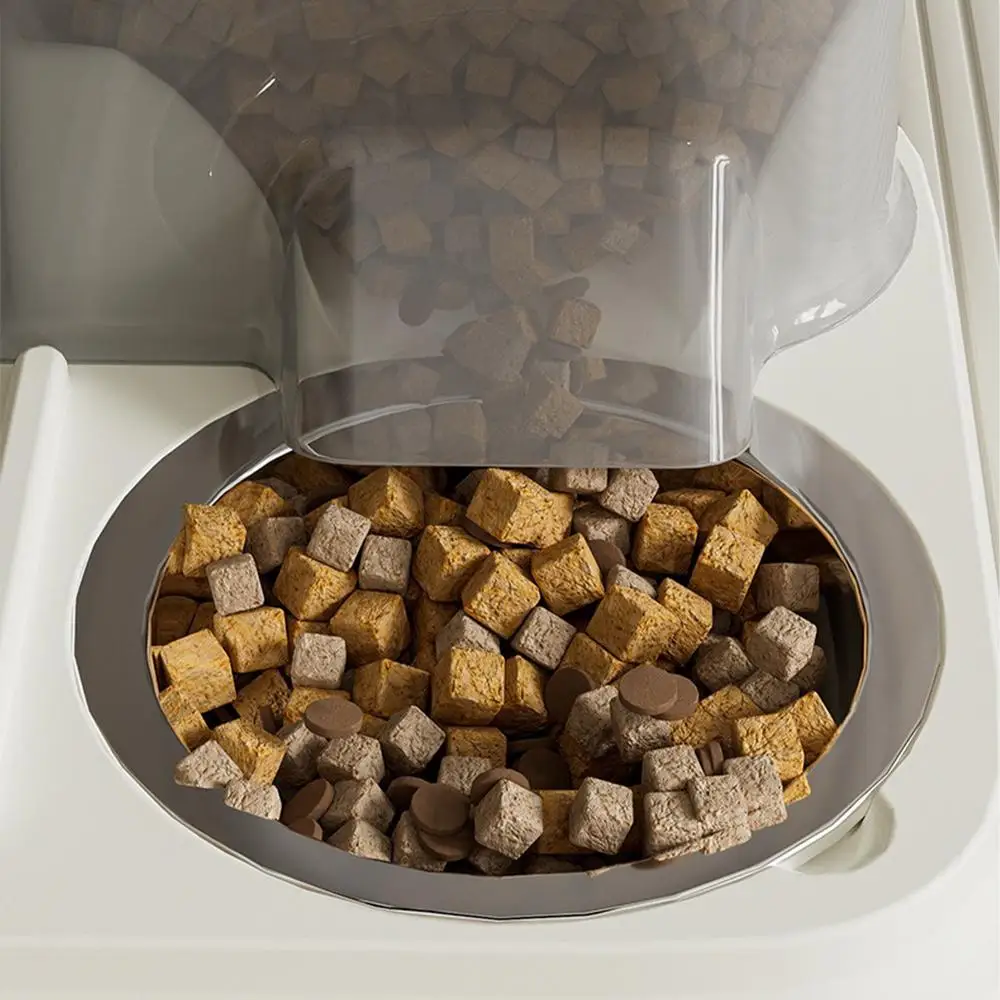 4. Trennung von Trocken- und Nassfutter: Dieser automatische Katzenfutterautomat sorgt dafür, dass Trocken- und Nassfutter getrennt aufbewahrt werden, um die Frische zu erhalten und gleichzeitig Feuchtigkeitsansammlungen zu verhindern, sodass die tägliche Fütterungsroutine optimiert werden kann.