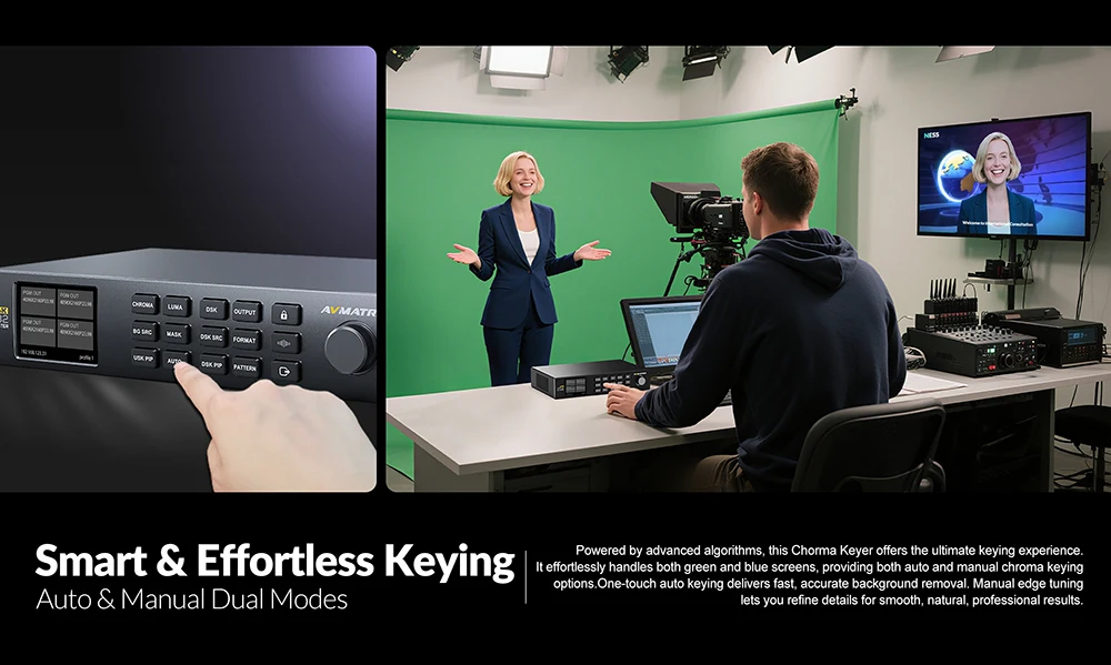 Dank fortschrittlicher Algorithmen bietet dieser Chorma Keyer das ultimative Keying-Erlebnis. Er verarbeitet mühelos sowohl Green- als auch Bluescreens und bietet sowohl automatisches als auch manuelles Chroma-Keying. Auto-Keying per Tastendruck ermöglicht eine schnelle und präzise Hintergrundentfernung. Mit der manuellen Kantenoptimierung können Sie Details verfeinern und so glatte, natürliche und professionelle Ergebnisse erzielen.