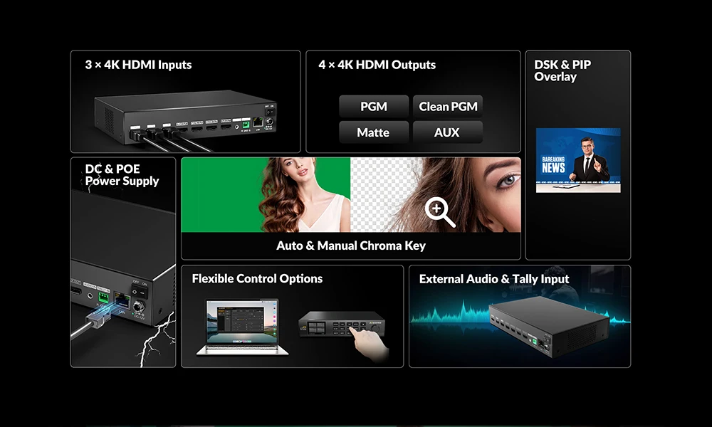 Dieser fortschrittliche Chroma-Keyer verfügt über drei 4K-HDMI-Eingänge und unterstützt Vordergrund (FG), Hintergrund (BG) und DSK für eine flexible und präzise Chroma-Key-Einrichtung. Er bietet einen hochwertigen 4K-HDMI-Programmausgang (PGM) sowie Matte-Out-, Clean-Out- und Auxiliary-Ausgänge (AUX) und gewährleistet so eine nahtlose Signalumschaltung für vielfältige Produktionsanforderungen.