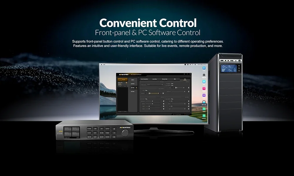 Unterstützt die Steuerung über die Fronttastatur und die PC-Softwaresteuerung für unterschiedliche Einstufungspräferenzen. Verfügt über eine intuitive und benutzerfreundliche Oberfläche. Geeignet für Live-Events, Remote-Produktion und mehr.