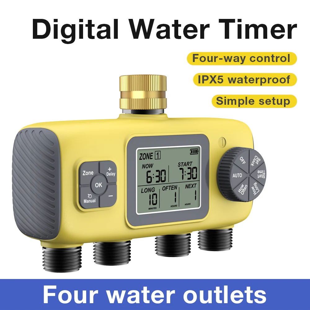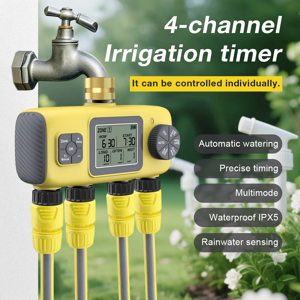 Digitaler Wassertimer, 4-Ausgänge, Gartenbewässerungstimer, Regenwassersensor, Bewässerungssystem, Präzisions-Zeitsteuerung