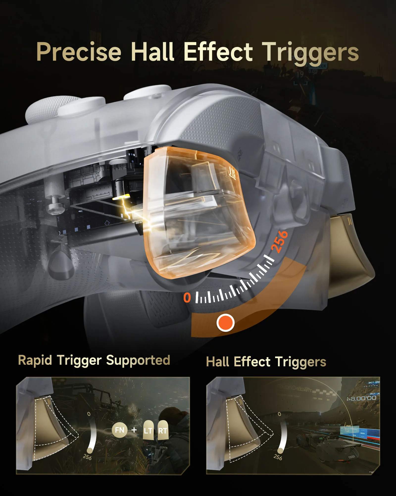 Hall Effect Joystick and Trigger: The joystick and trigger use Hall effect sensors and can apply ultra-fast trigger mode. It provides unparalleled accuracy and responsiveness, ensuring consistent input for superior control in every game