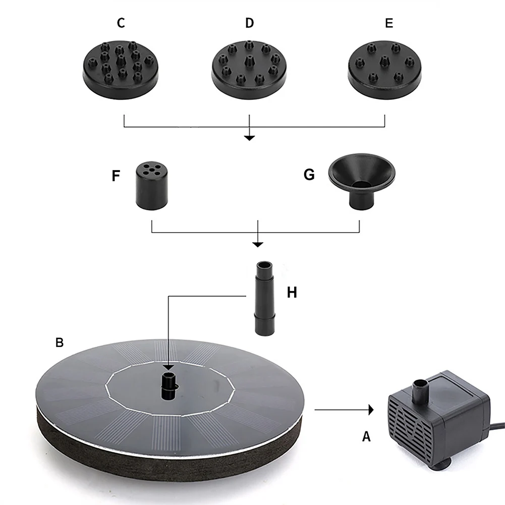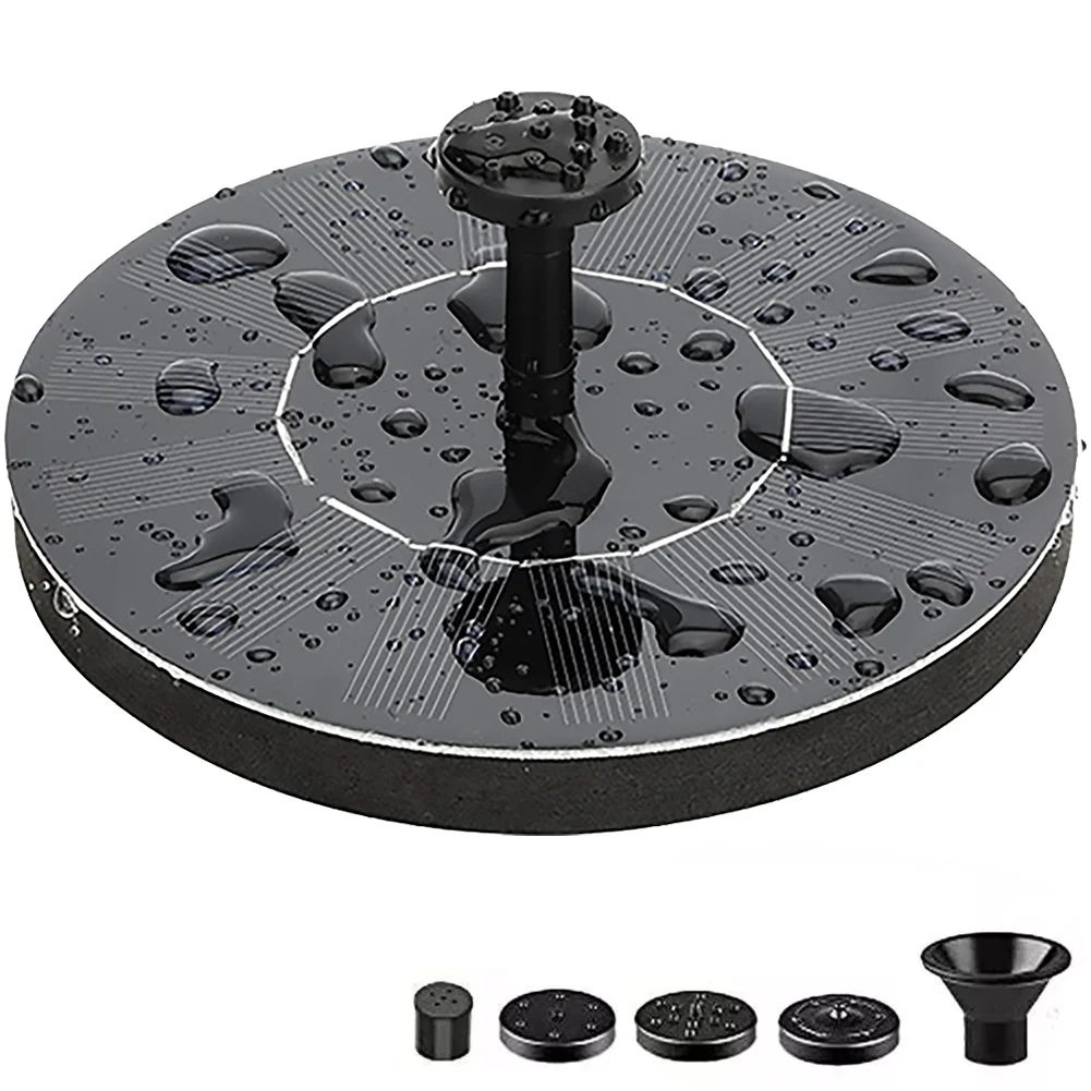 Feature: 1. Eco-Friendly Design: Embrace the essence of spring in your garden with the solar fountain pump, a 1W solar-powered that operates on sunlight alone, requiring no electricity or batteries. It automatically runs within 3 seconds under sufficient sunlight, with a spray height of 35-50cm, adding a touch of wonder to your outdoor space. 2. Versatile Spray Patterns : Equipped with 6 different nozzle types, the solar bird bath fountain allows for easy adjustment of water height and pattern. Its specialized anchoring system prevents the fountain from moving randomly, enabling you to enjoy the serenity of gently flowing water and the soothing sound of a breeze. 3. Advanced Technology: The solar powered fountain pump features cutting-edge technology including dry-run protection that stops the pump when it leaves the water surface, a filtration box that blocks dirt, dust, and leaves to extend its lifespan, and a PET laminated solar panel that ensures performance even in harsh conditions. 4. Multipurpose Application: With a 5.1-inch diameter and a minimum operating depth of 1.2 inches, the solar powered water fountain is for bird baths, fish tanks, small ponds, swimming pools, and gardens, enhancing oxygen circulation. Simply place it in water to bring your pond to life with vibrant energy. 5. Helpful Tips: To ensure optimal performance of the floating solar powered water fountain pump, maintain a sufficient water level and keep both the water and pump clean to prevent clogging. Be mindful that leaves on the panel can halt operation, and remember, it does not store any energy, so it operates best under direct sunlight. Specification: Origin: Mainland China Model Number: Solar Powered Fountain Water Pumps Material: plastic electronic components