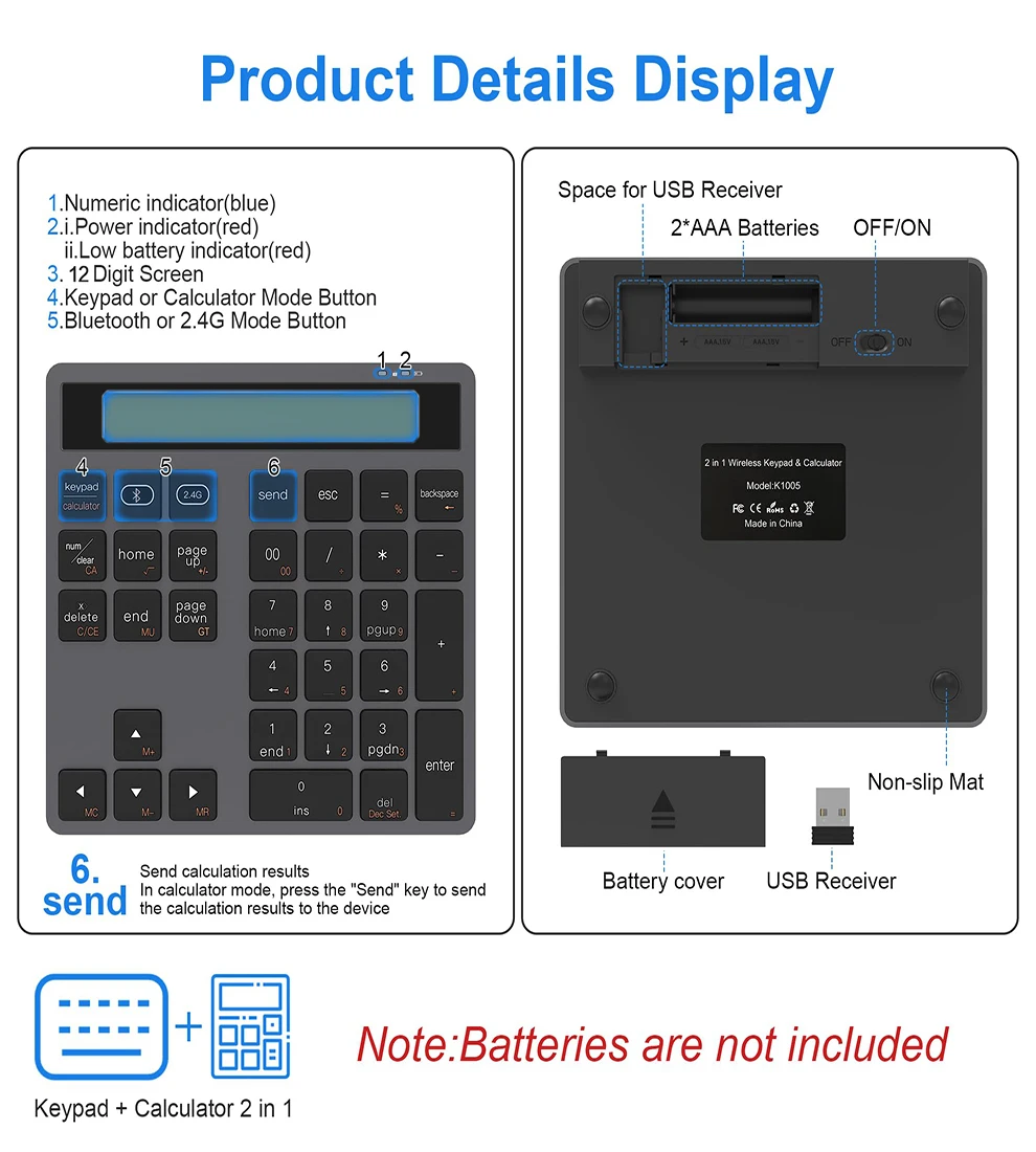 Multi-function 34-Key Keypad: With NumLock, ESC, Delete, pgup, pgdn, insert,00 and a keypad/calculator key which can switch calculator and keypad mode directly etc. The numeric keypad is equipped with calculator function, perfect for financial accountants, students, office specialists, and spreadsheet experts.
