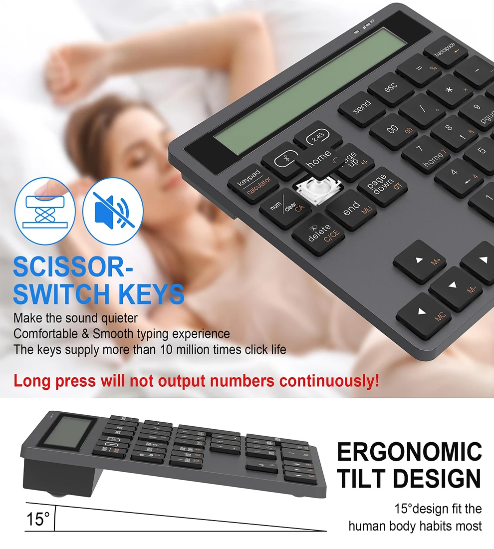Stability & Ulta-Slim Design: With advanced quiet SCISSOR-SWITCH KEYS provides a comfortable and smooth typing experience, quick response and good tactile rebound, keep the office quiet and improve work efficiency. Bluetooth number pad is constructed of solid and premium ABS materials for long-lasting use, 15Β° tilt design fits the human body habits, slim style appearance, great for spreadsheets worker, accounting staff and financial officer