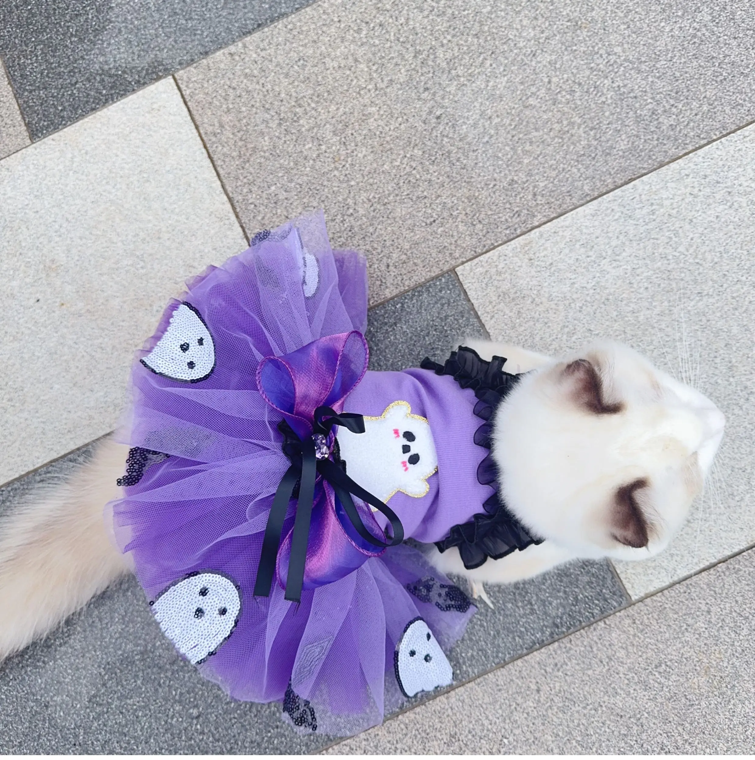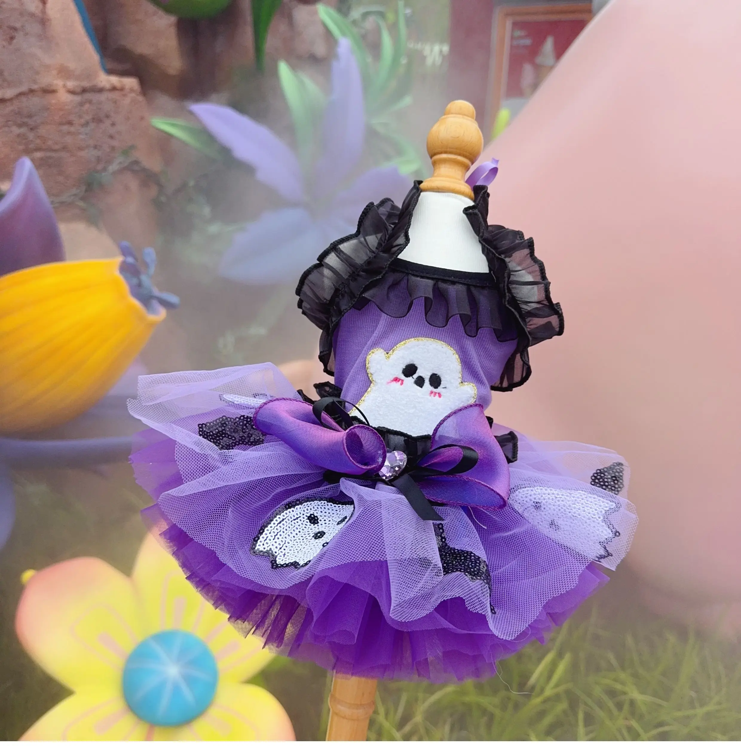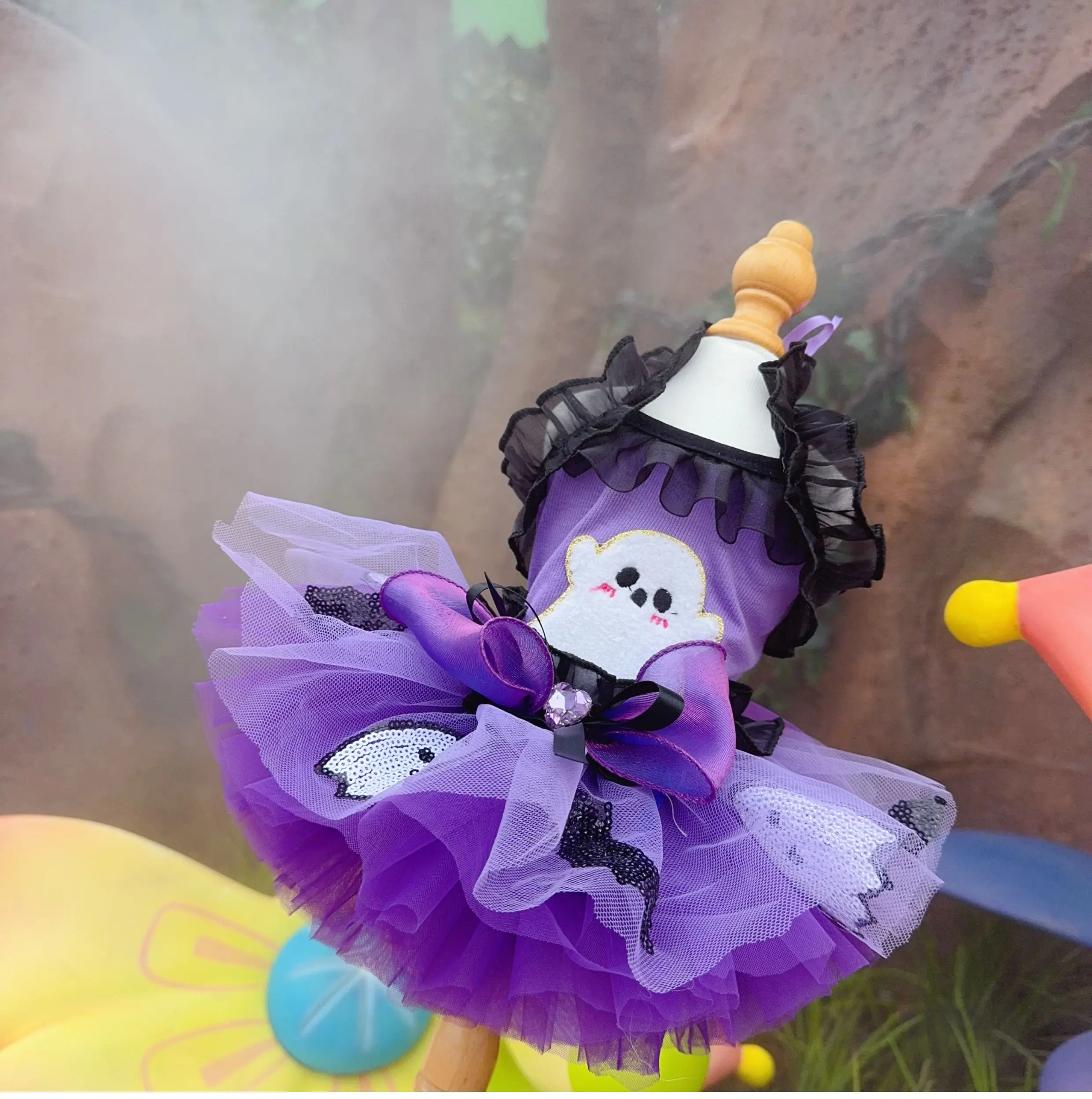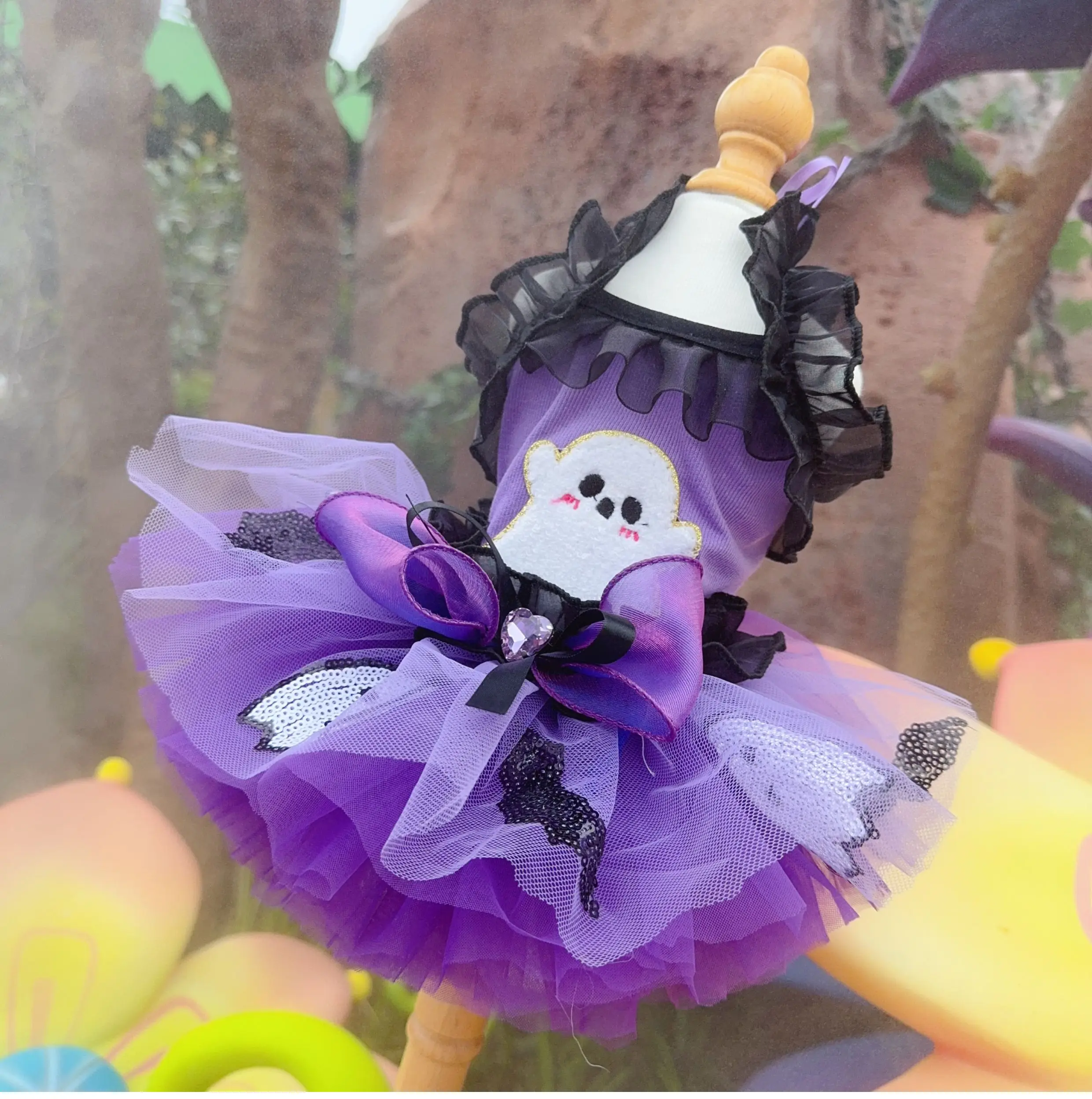 2025 Luxury Halloween Pet Dog Dress, Handmade Purple Ghost Bow Sling Princess Costume for Small Dog & Cat, Fashion Puppy Apparel