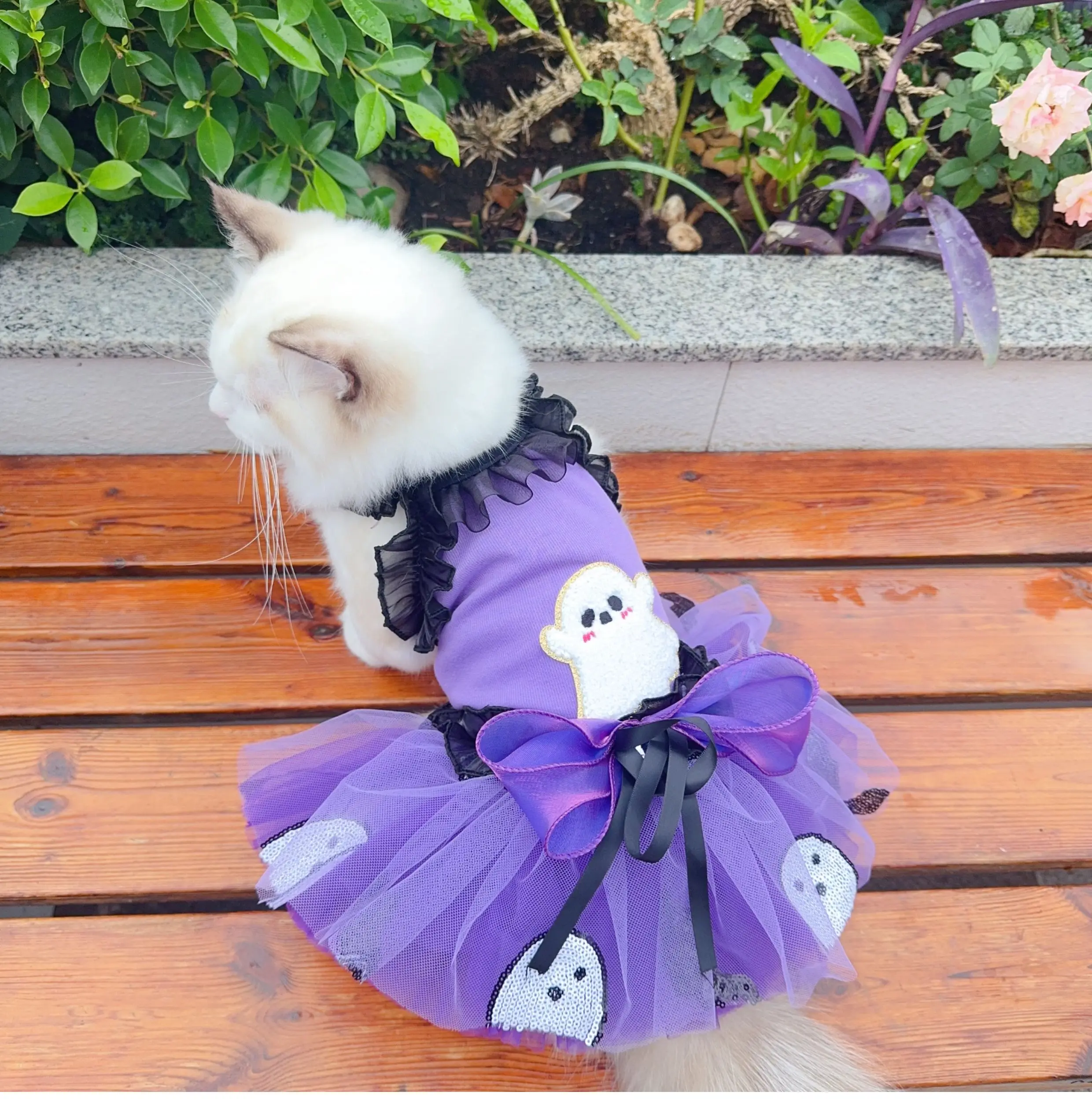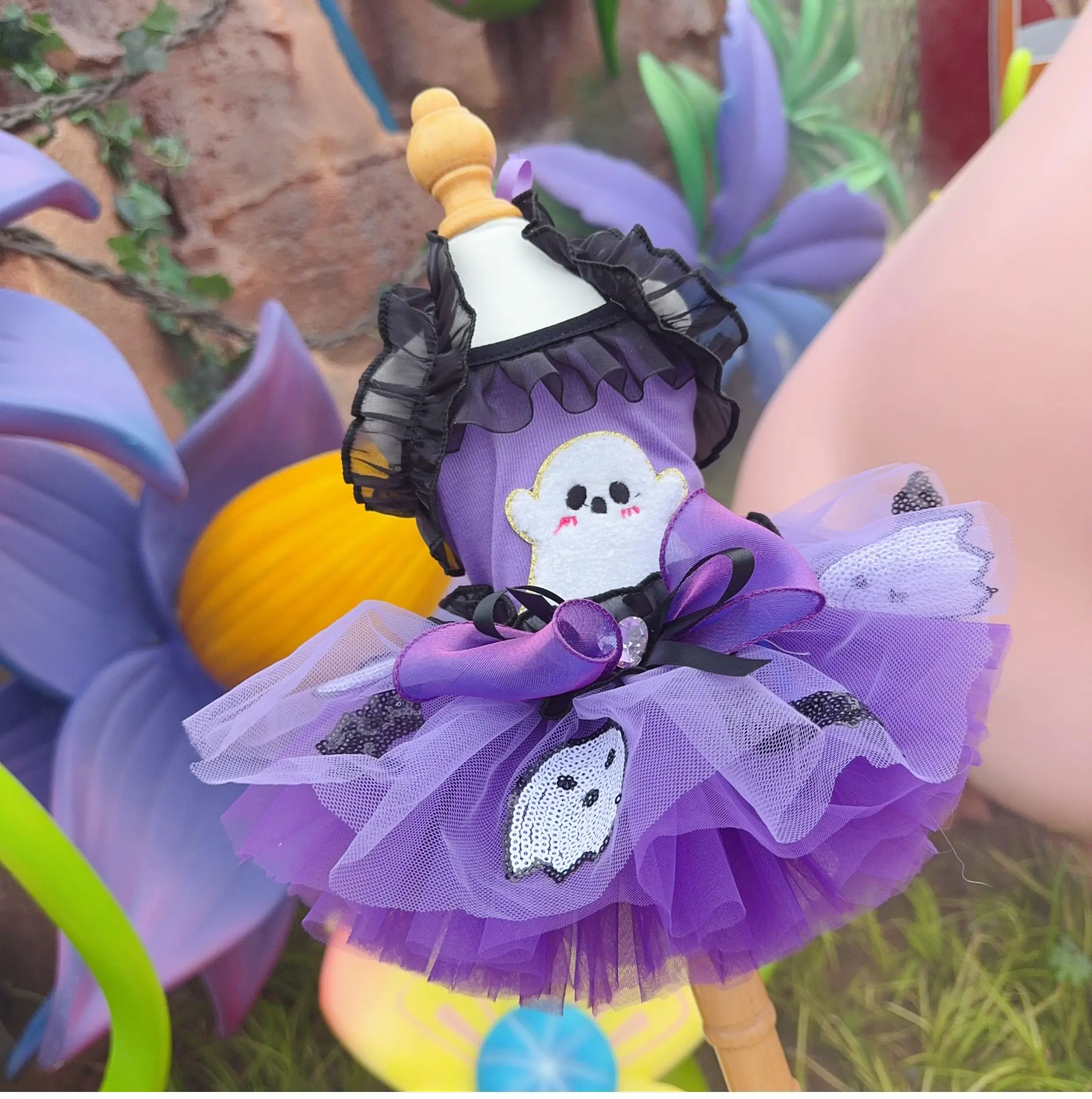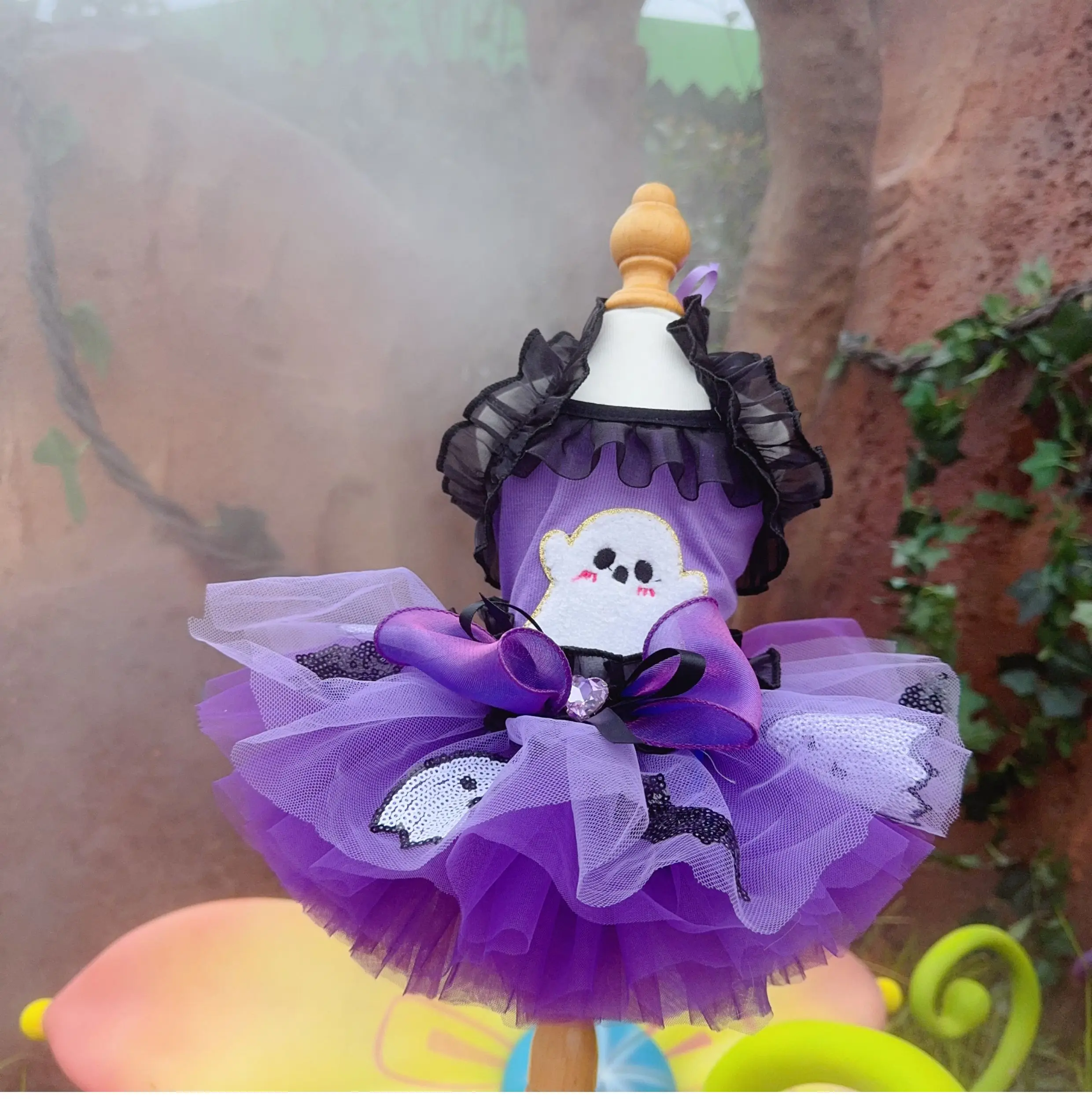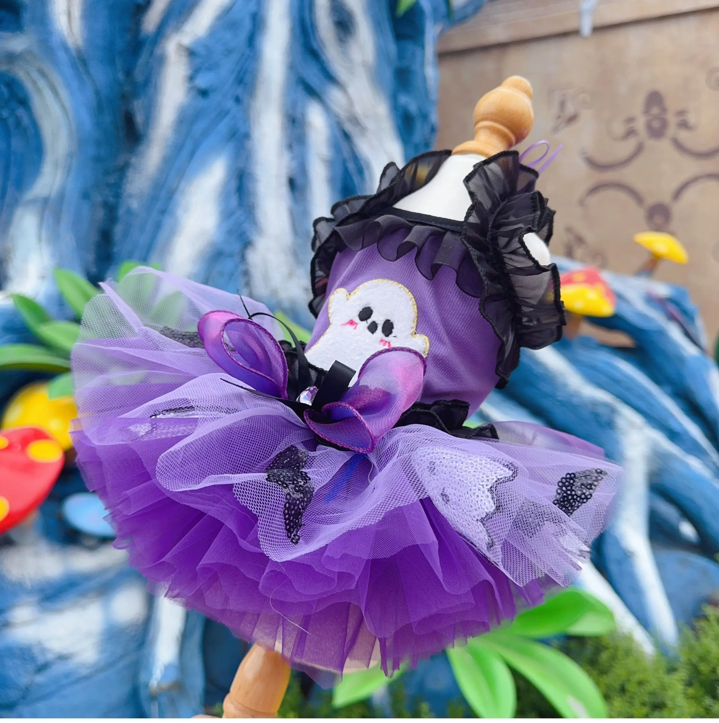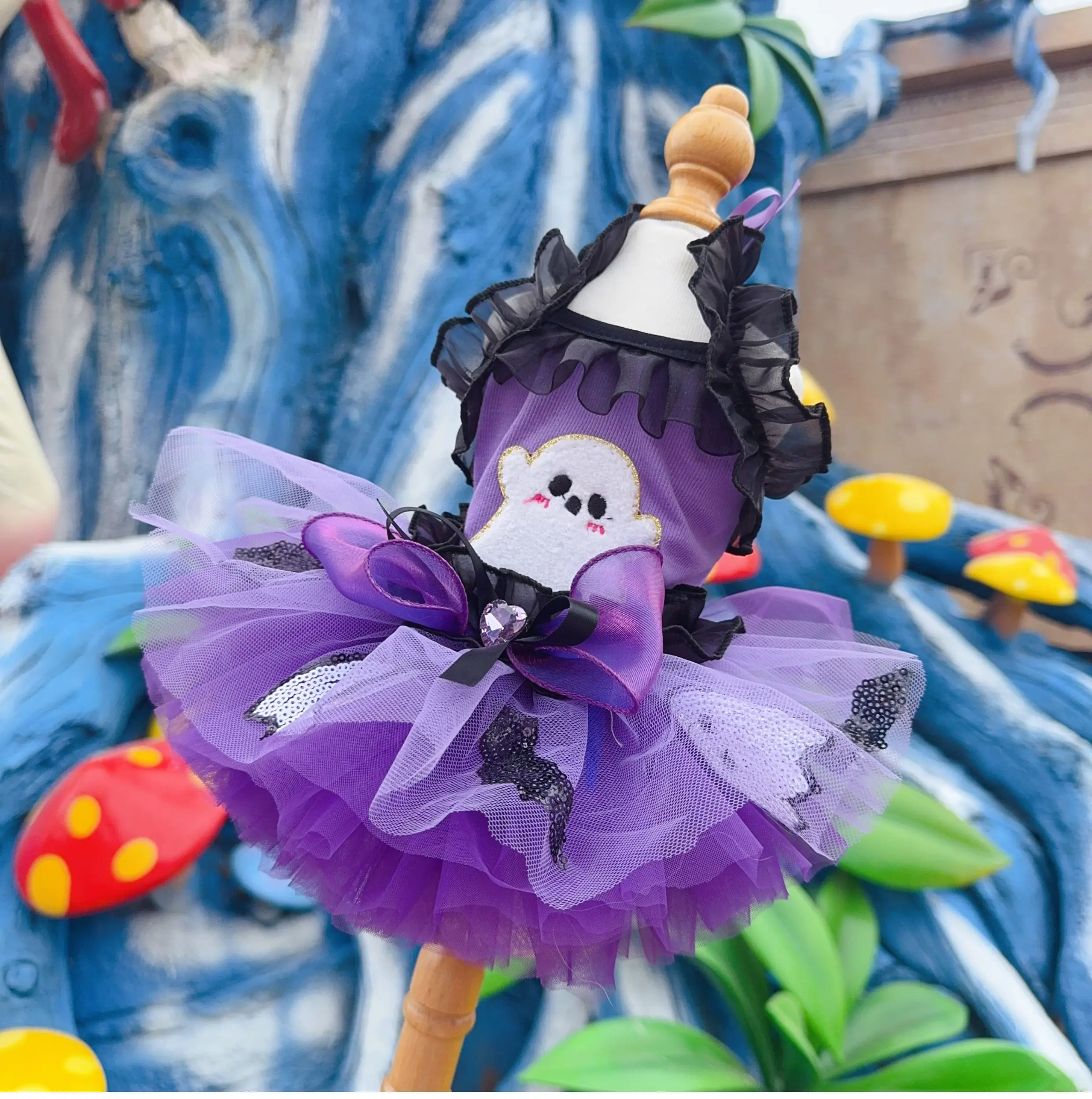 2025 Luxury Halloween Pet Dog Dress, Handmade Purple Ghost Bow Sling Princess Costume for Small Dog & Cat, Fashion Puppy Apparel