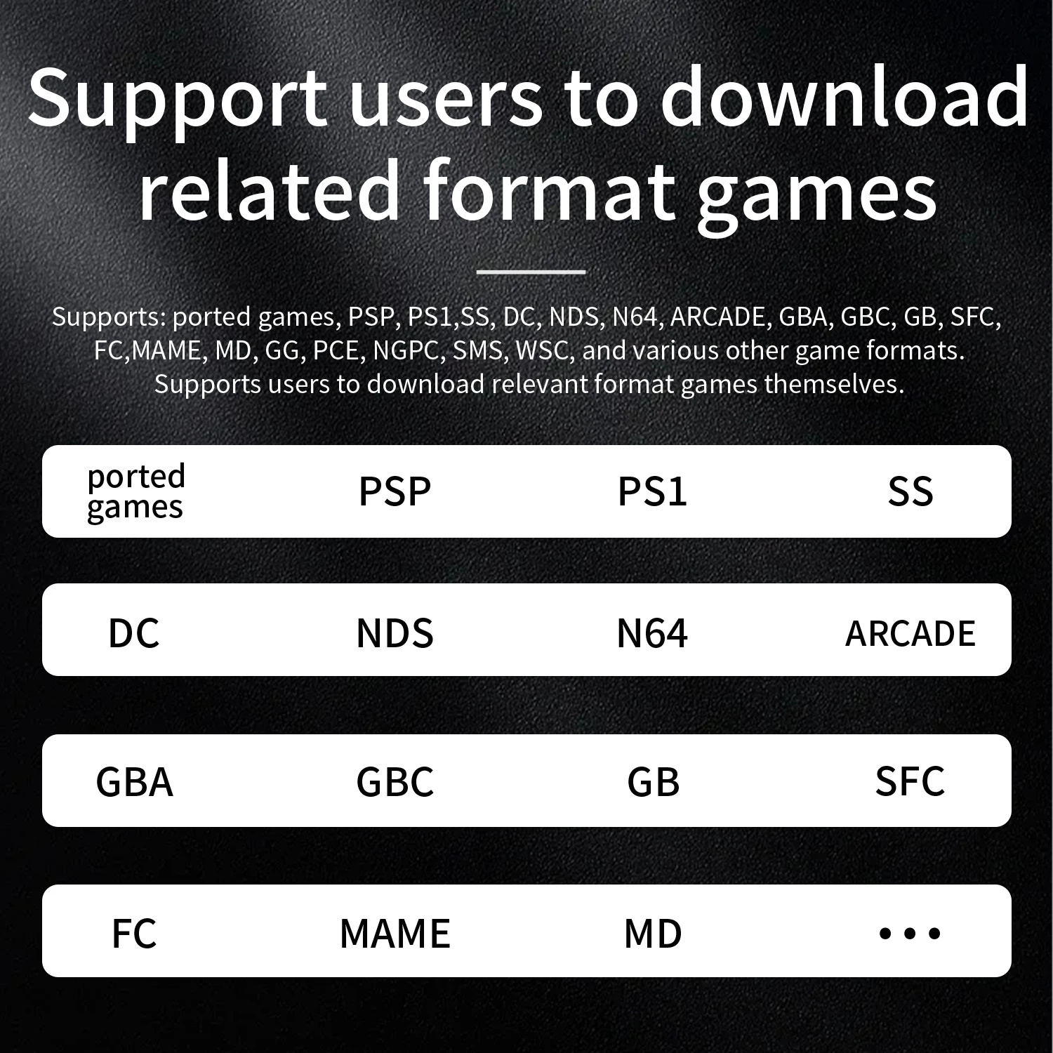 Supported: Ported games, PSP, PS1, SS, DC, NDS, N64, ARCADE, GBA, GBC, GB, SFC, FC, MAME, MD, GG, PCE, NGPC, SMS, WSC, and various other formats.