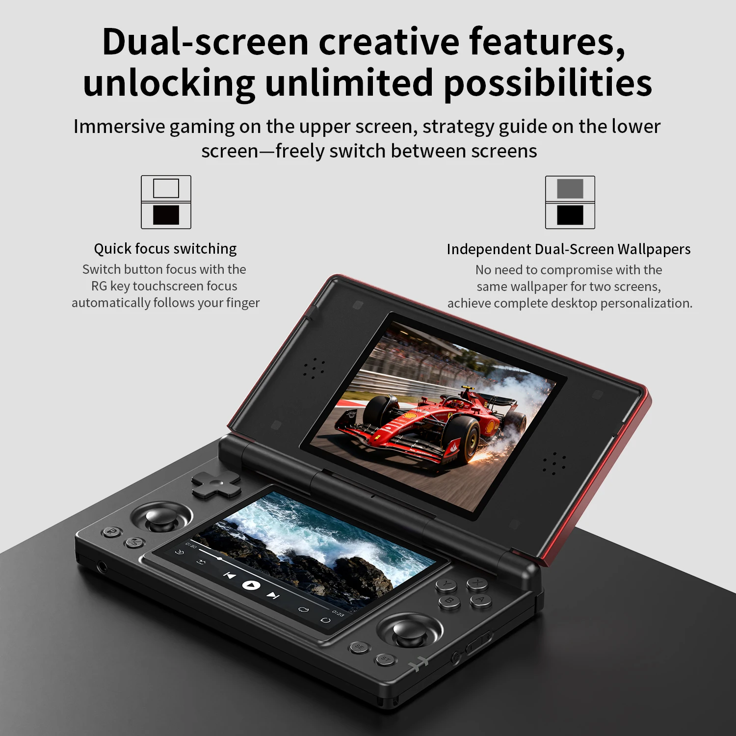 Dual-Screen Gaming:Both Screen are 4-inch IPS panels with OCA full lamination. The 4-inch IPS displays enable authentic gameplay for NDS,a significant advantage over single-screen competitors.