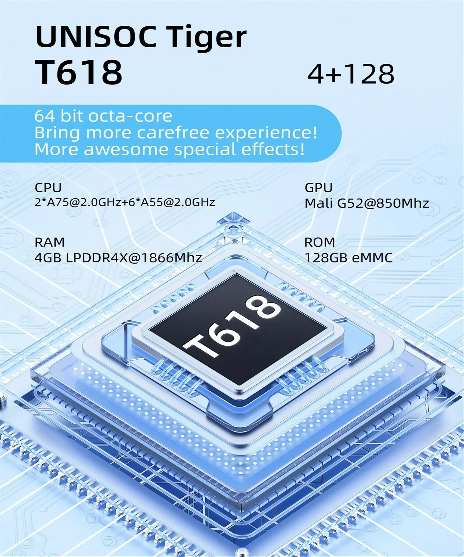 Equipped with a powerful Unisoc Tiger T618 64-bit octa-core CPU, this device