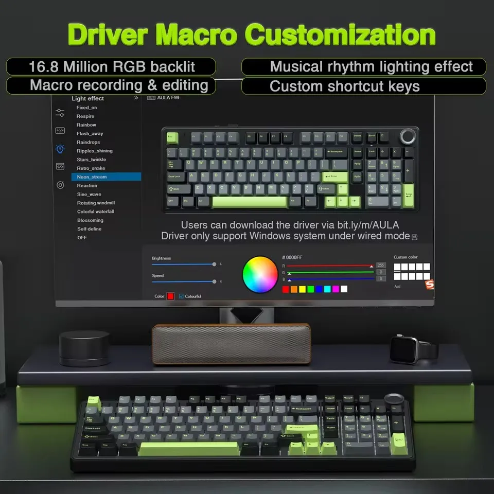 Create your personalized keyboard experience using the AULA DRIVER to remap keys, adjust RGB effects, create macros, and access more functions. This customization allows you to tailor the F99 PRO to meet your specific needs and preferences.