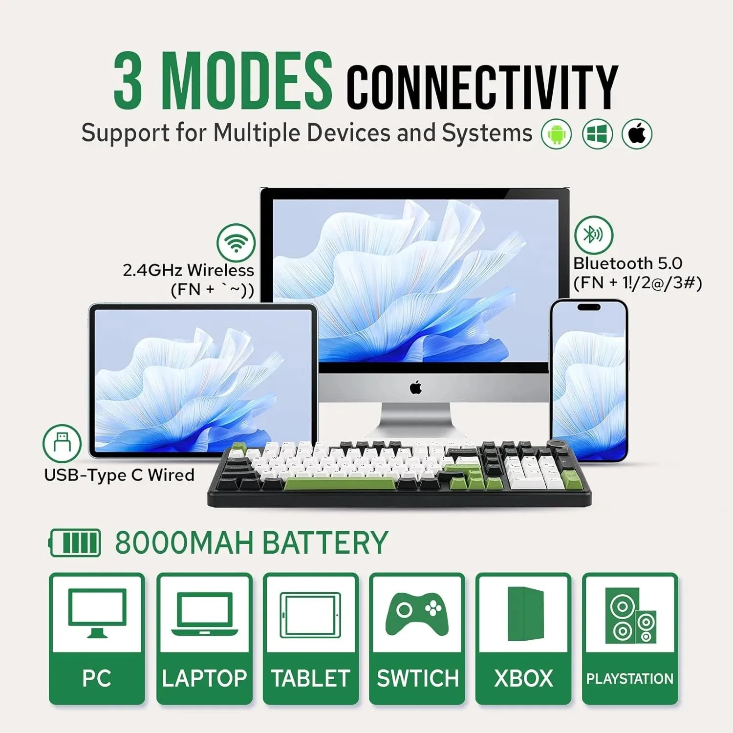 Supporting Bluetooth 5.0, 2.4GHz wireless, and Type-C USB wired connections, the F99 PRO offers versatile and seamless connectivity up to 10 meters. Its robust 8000mAh battery ensures efficient multitasking and sustained performance across all three connection modes, making it ideal for both work and play.