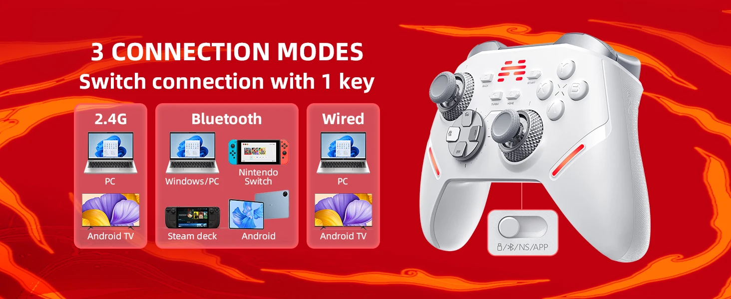 Works with PC, Switch, Steam, iOS, and Android, easily switch between modes with back platform button.