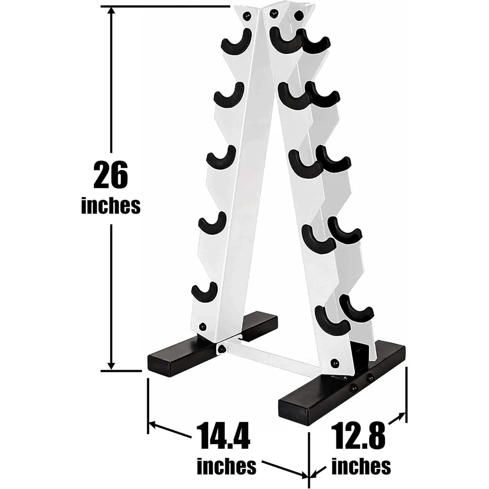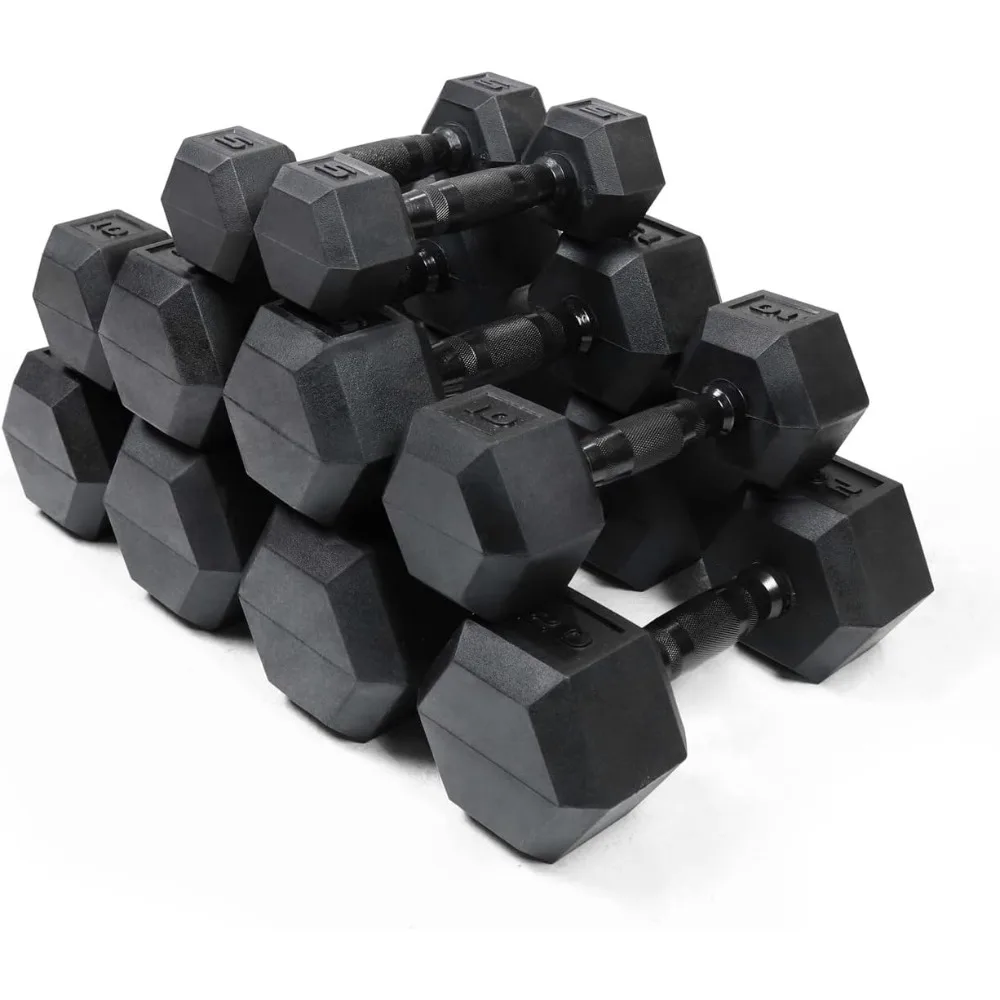 This product features a set of black handle rubber hex dumbbells with varying weights, ranging from 5-pound to 25-pound increments, along with an A-frame dumbbell rack for organized storage. The set is shipped in multiple boxes and may arrive on different days; customer service is available for any delivery concerns. The A-frame design of the rack is space-saving, storing dumbbells vertically and protecting them from scratches with rubber inserts. The rack is constructed from steel with a durable black powder coat finish, while the dumbbell heads are made of ASTM A48 Class 20 grey iron, connected by 1018 cold rolled solid steel contour handles. The hexagonal shape of the dumbbell heads prevents them from rolling, and the medium depth knurling on the handles ensures a secure grip. The rubber coating is both durable and effective. These dumbbells are ideal for targeting specific muscle groups or for full-body workouts, suitable for isolation exercises, functional training, HIIT workouts, and strength training routines.
