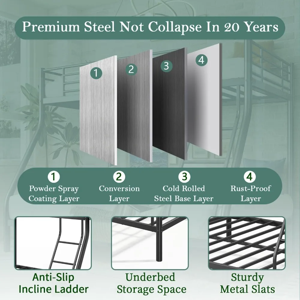 • 【Premium Materia】The bunk beds twin over full is made of modern design and sturdy metal frame structure, and the surface is rust-proof powder coated. It is stable and you can turn over freely when sleeping without making loud noises. No box spring required, metal slats support the mattress without sliding.