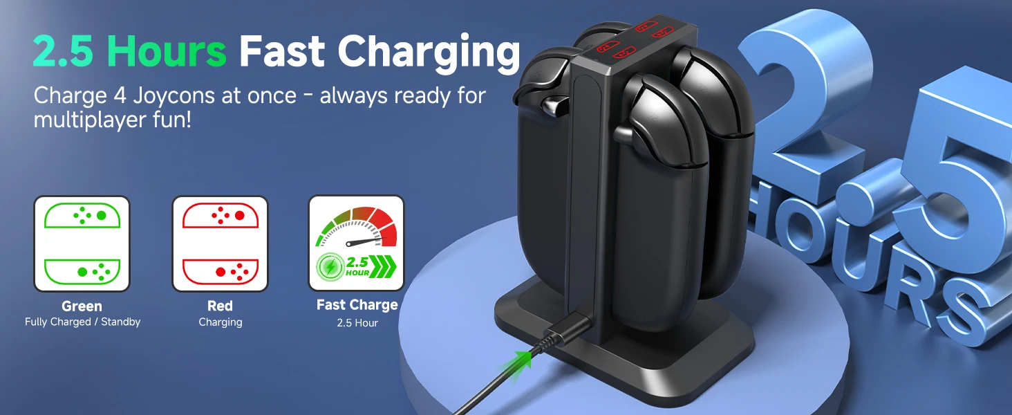 γFast ChargingγUse this switch 2 joy-con charging station, you can fully charged your joycon within 2.5 hours. It will lights red when charging and lights green when fully charged.