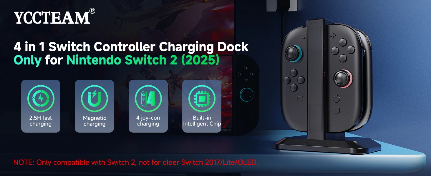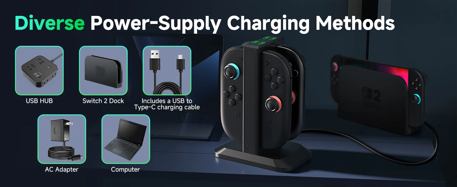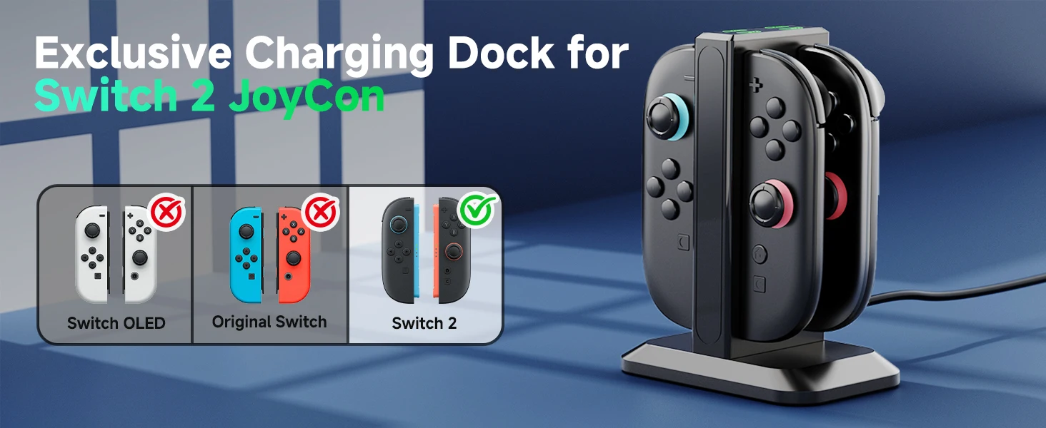 γDesigned for Nintendo Switch 2 Joy-ConsγSpecially built for Nintendo Switch 2 Joy-Con controllers, this joycon charging dock powers up to 4 Joy-Cons simultaneously. Powered via USBοΌJust put your Joy-Cons into the charging dock and plug the cable into any USB portβit starts charging right away.