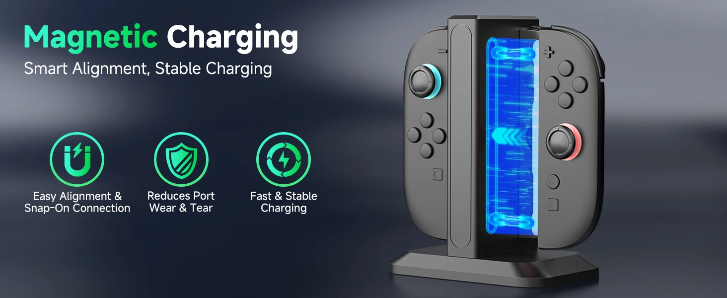 γMagnetic& Weighted Designγ The magnetic alignment system and solid weighted base keep your Nintendo Switch 2 Joy-Cons securely in place. Fast, precise docking without tipping or scratching your controllers.