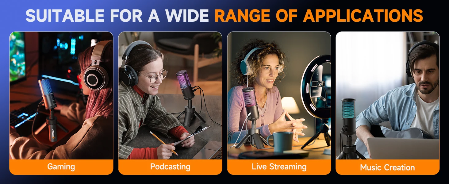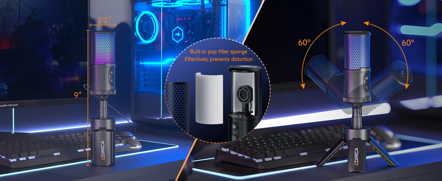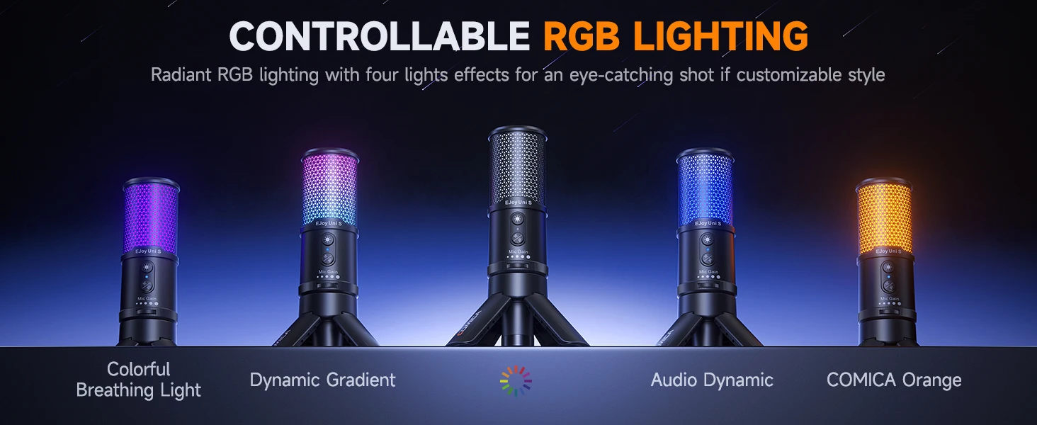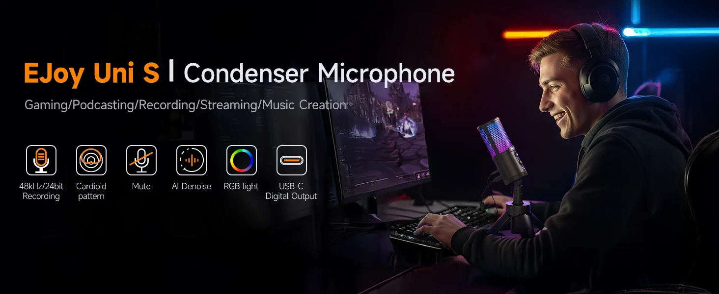 The EJoy Uni S I condenser microphone suits gaming, podcasting, recording, streaming and music creation. It supports 48kHz/24bit recording, adopts a cardioid pattern, and has mute + AI denoise for clear audio. It also has RGB light for ambiance and USB-C digital output for easy device connection.