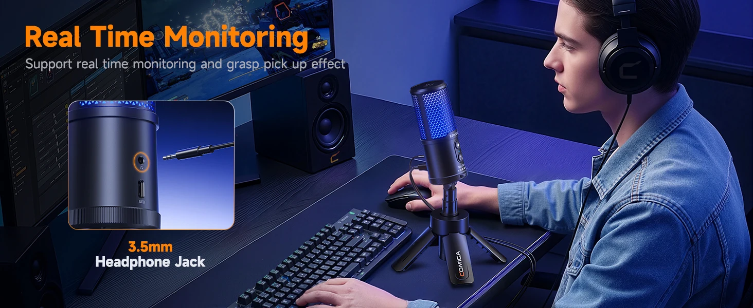COMICA UNI S USB Gaming Microphone with RGB Condenser Mic with Gain Control Monitoring AI Denoise for PS4,PS5,PC for Streaming