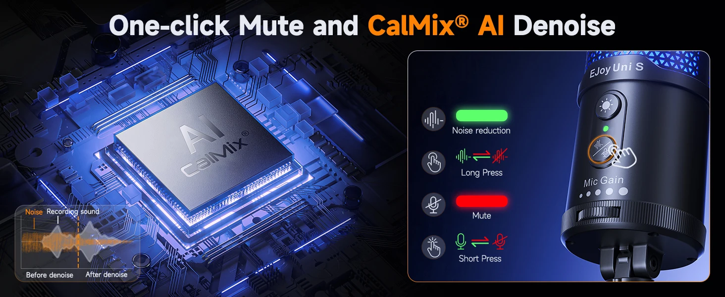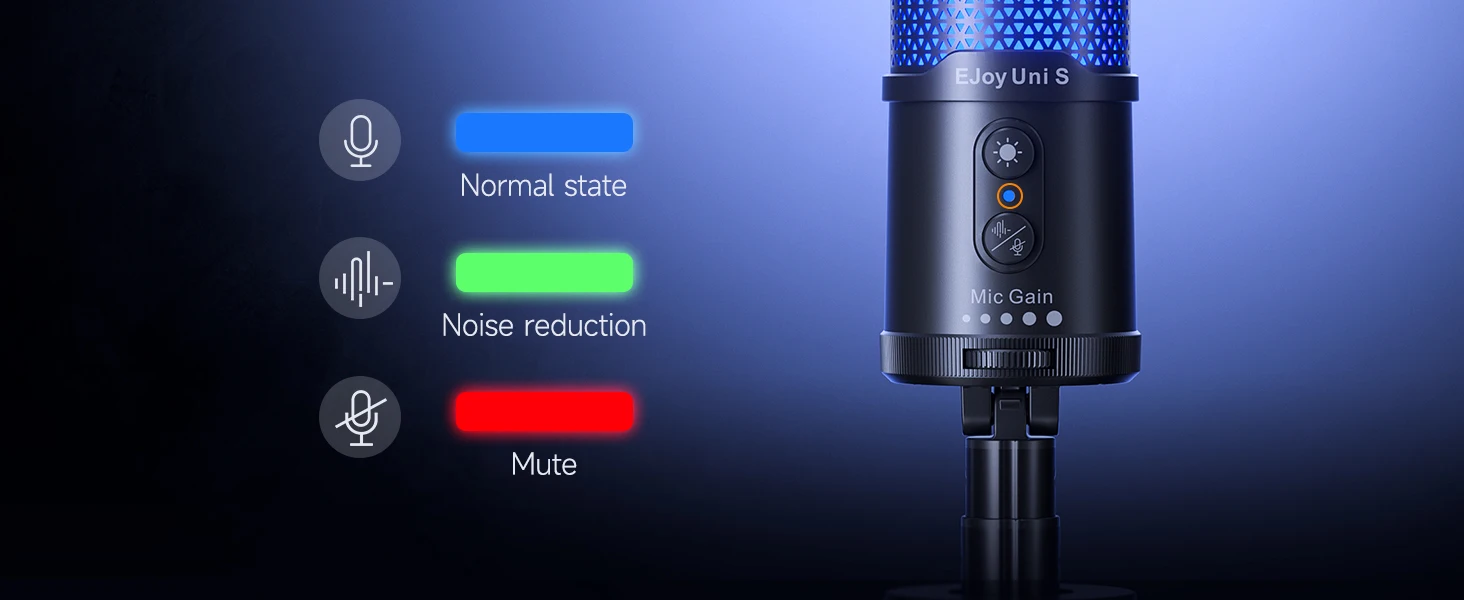 The EJoy Uni S microphone has three status indicators: blue indicates the normal state, green signifies noise reduction, and red represents mute. Additionally, it is equipped with controls for mic gain.