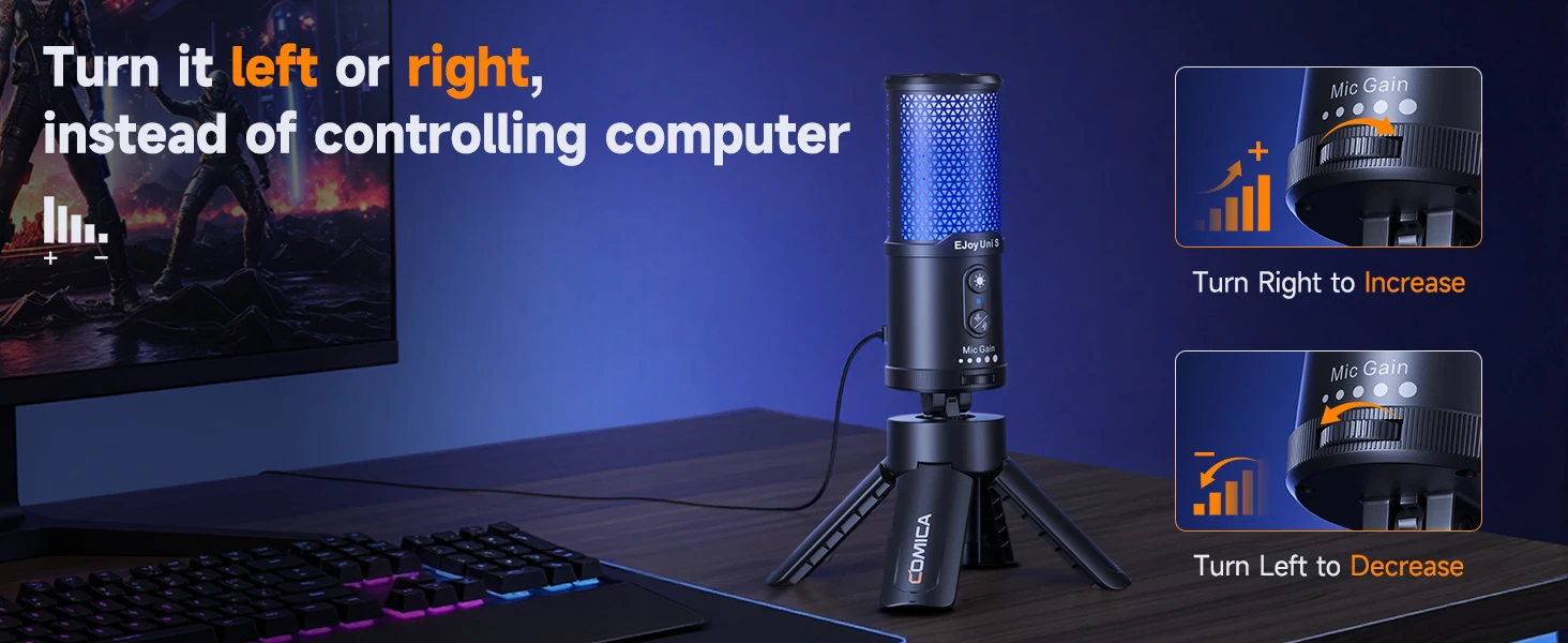The microphone features a "Mic Gain" adjustment function:you can turn the relevant knob left or right to adjust the gain—turning right increases the gain, and turning left decreases it—without needing to control via a computer.