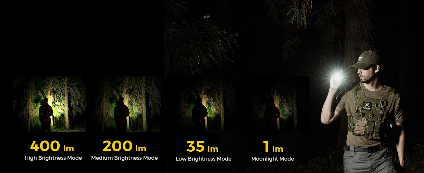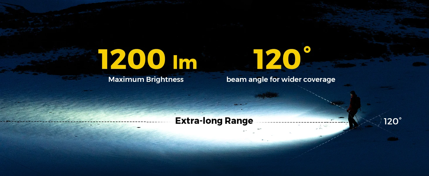 Our flashlight is equipped with Luminus SST40 WCS R55 LED chips, providing exceptional illumination capabilities with five adjustable brightness modes. In ultra-bright mode, it delivers a maximum luminous flux of 1200 lumens, while the beam angle reaches up to 120Β°, ensuring extensive coverage. Additionally, it features an SOS mode for emergencies and a strobe mode for signaling or defense, making it a versatile companion for any situation.
