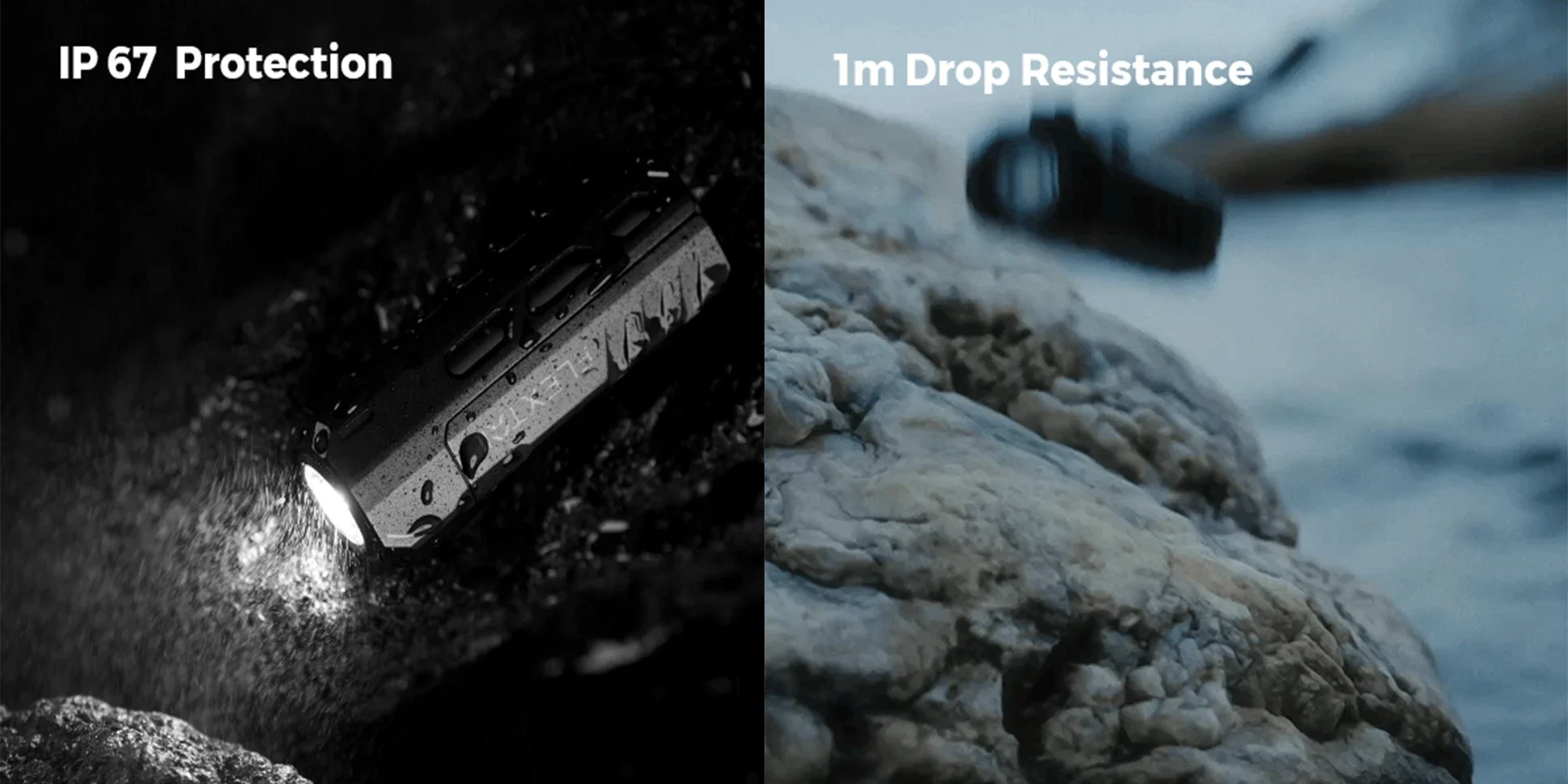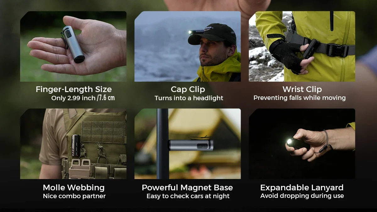 Our flashlight offers enhanced functionality and reliability. It can be clipped to a cap brim to transform into a headlamp, or secured at the waist to prevent slipping during movement. The magnetic base allows for hands-free use, while the extended lanyard provides additional carrying options. With an IP67 rating for dust and water resistance and the ability to withstand drops from up to one meter, this flashlight is built for durability in any environment.