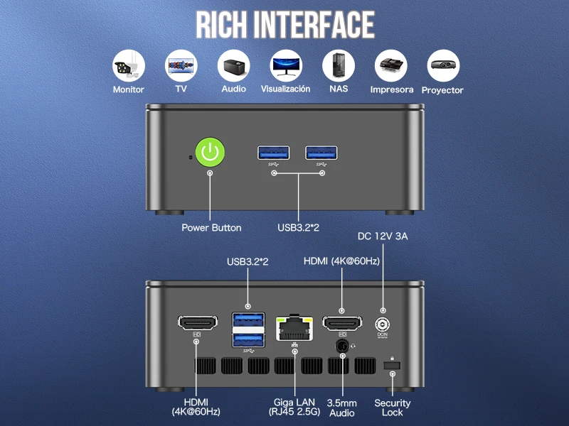 lnterface: 1 x DC Port; 4 x USB 3.2 Ports; 2 x HDMI Ports; 1 x RJ45 Ethernet LAN Port 2.5Gbps; 1 x 3.5mm Audio Port(HP&MIC)