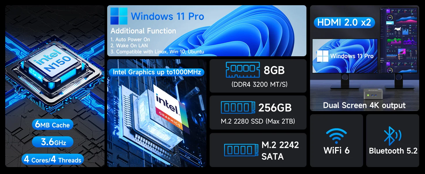 GMKtec G3 Plus Latest Twin Lake N150 Mini PC DDR4 3200MT/s NVMe SSD WiFi6 BT5.2 Windows 11 Pro 2.5G RJ45 Desktop Office Computer