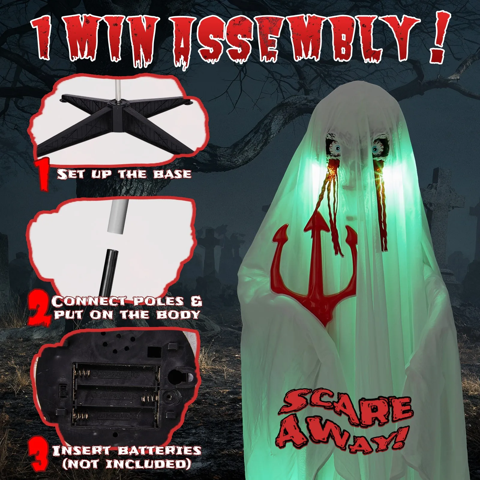Bring your Halloween scene to life with this terrifying animatronic ghost with trident. Standing at life size, this sound-activated Halloween decoration is designed to shock and thrill. Once triggered, the ghost's glowing green body light up and eerie sounds play, creating an unforgettable spooky experience. Ideal for haunted houses, yard displays, or indoor Halloween parties, it sets up in just minutes and runs on batteries, giving you complete freedom to place it wherever the scares are needed most.