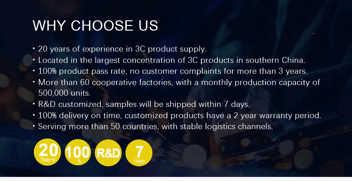 We are Guangzhou QingNiao Intelligent Technology Co., Ltd. has been focusing on 3C electronic product supply chain for 20 years. It is located in the largest 3C distribution center in southern China. We are authorized by HP, Lenovo, Dell and other brands. We have a professional R & D team, which can not only provide 3C products, but also provide OEM / ODM services. The long-term cooperation of factories is the perfect guarantee for our customized products. At the same time, we provide customers with timely and efficient delivery services. We have long-term and stable logistics channels. The spot samples are delivered within 3 days, and the customized samples are delivered within 7 days. The punctuality rate of delivery time is 100%. We hope to work together with more and more partners for common growth and win-win results.